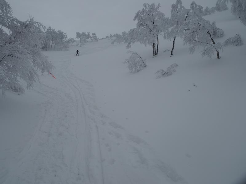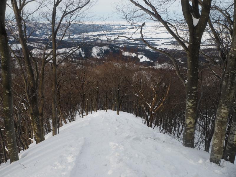 先行の方々は既に下って頂上には私一人。ゆっくりしたいところですが、寒いので小屋に隠れて軽く腹ごしらえ、飯豊を何度も振り返りながら下りました。そして下山のお楽しみ、スノーシューモフモフ下り!トレースの無い場所を自由に駆け下る冬ならではの遊びです。雪崩れそうな場所ではNGですが、ルートをちょっぴり外れて思い切り雪と戯れることができます。一合目までずっとこの調子だったので少々疲れてしまいました。この後林道歩きもあるというのに。節度を守って楽しみたいですね。
