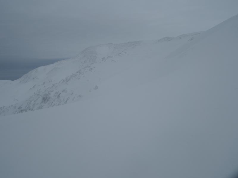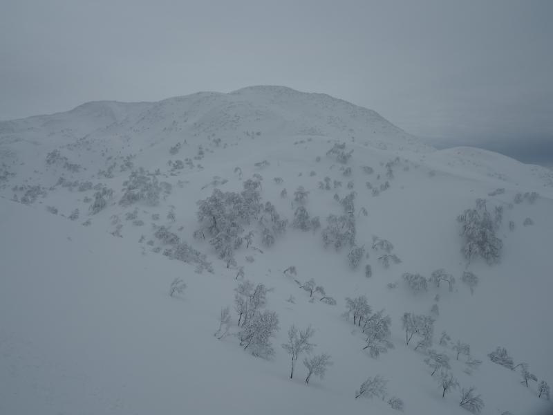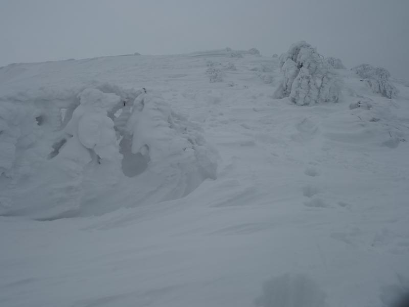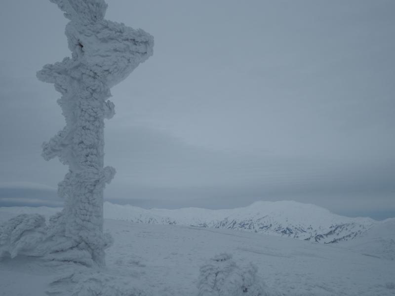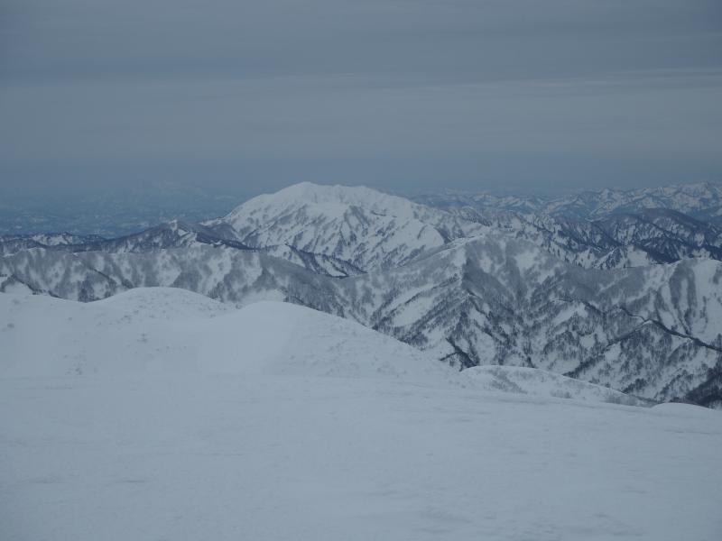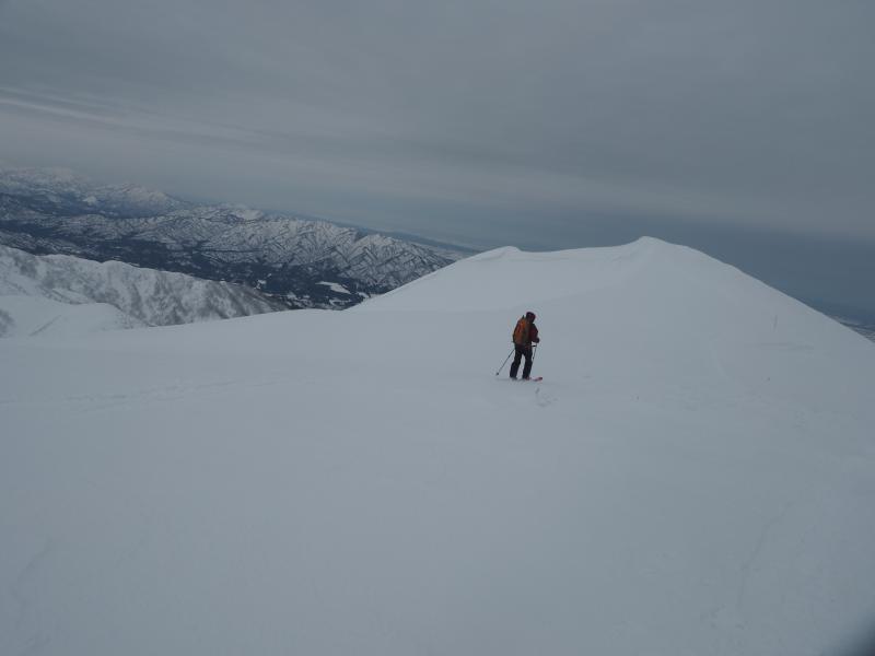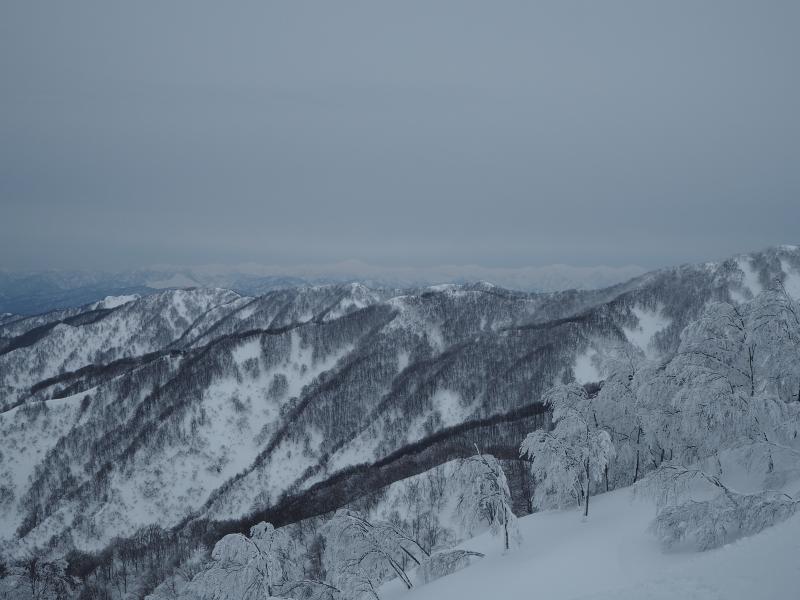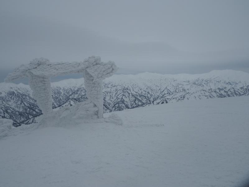 ここに油こぼしが埋まっているだろう急登を登り詰めると頂上付近がようやく現われました。景色は一変、世界は白一色に変わります。風も強まり装備を着込んで山頂を目指します。まだ二王子に隠れて飯豊は見えませんが、朝日連峰が左手に白く連なっていました。振り返ると曇天ながら佐渡もくっきり、冬は空気が澄んでいるので遠くまで綺麗に見渡せるところが素晴らしいです。