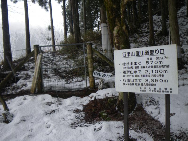 行市山(ぎょういちやま・659m)は戦国時代・賤ヶ岳の戦い時に柴田勝家の重臣・佐久間盛政が構えた陣所跡が山頂にある山で余呉トレイルの一部になっています。隣の賤ヶ岳同様、山全体が砦になっていて、名だたる武将の名前がでてきます。砦巡りコースが整備されていて、スノーシューには最適の山です。今回は全く見えませんでしたが、頂上まで400m看板地点と頂上(樹木が切り取られています)からは東側の展望が得られます。