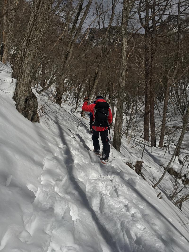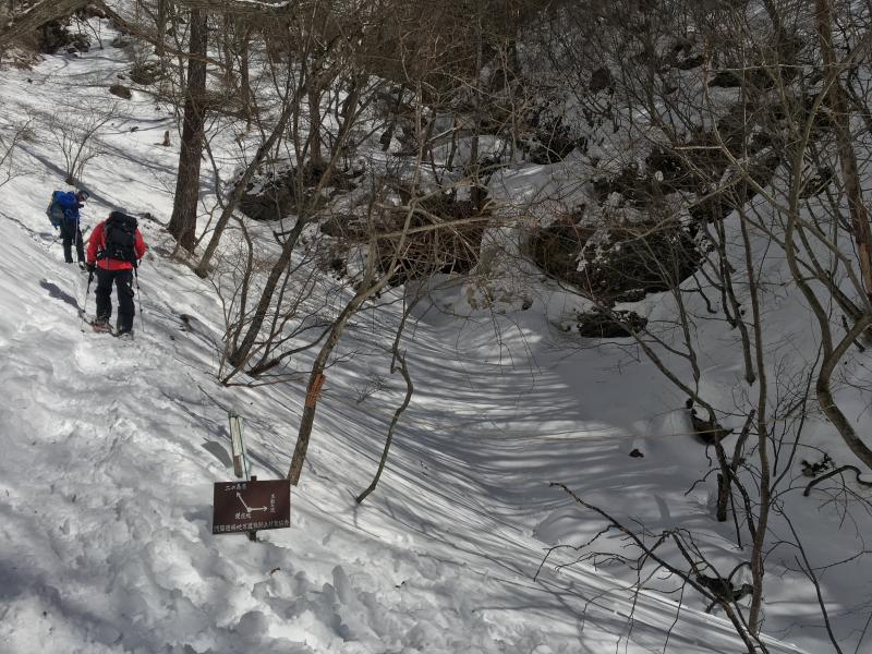 山荘周辺は除雪されてますが、鳥居をくぐるとたちまち白銀の世界。ツボ足でも進めますが、ここからスノーシューやワカンを装着しても良いです。