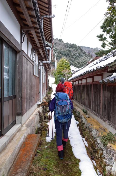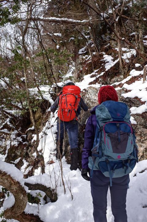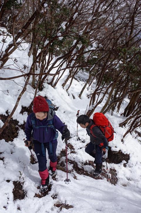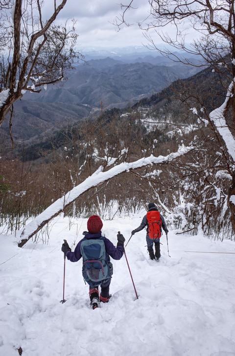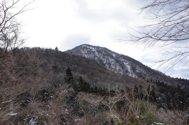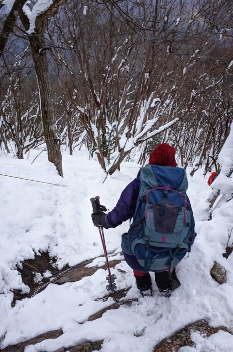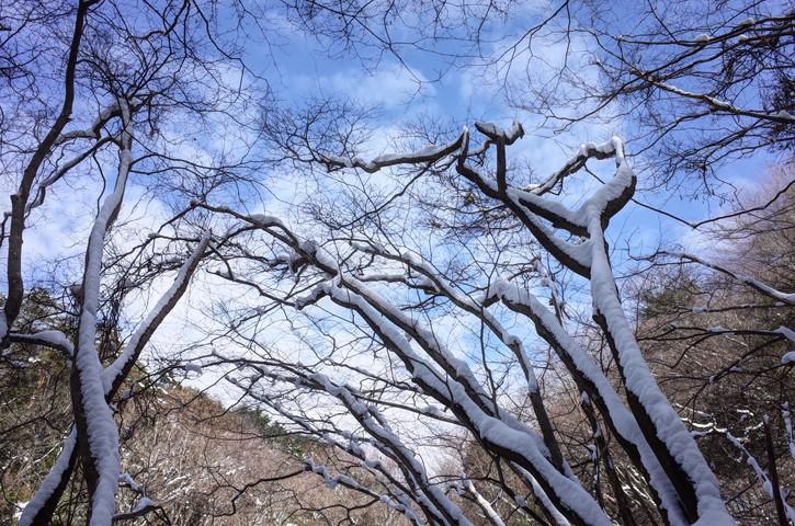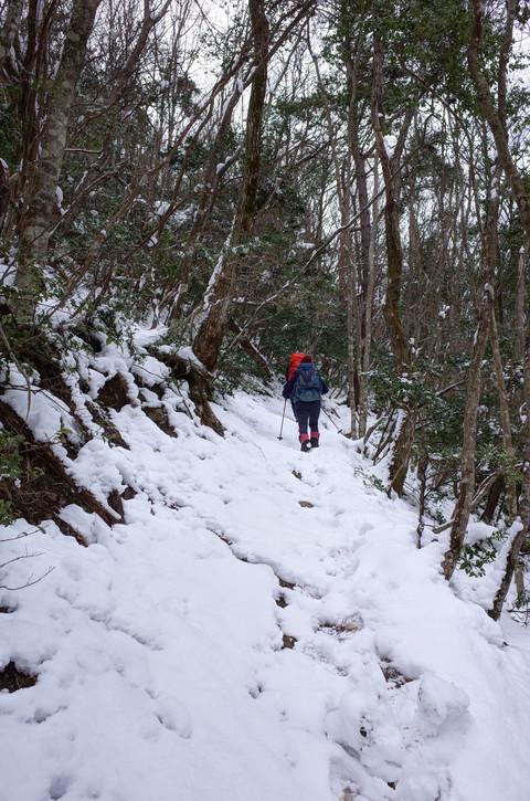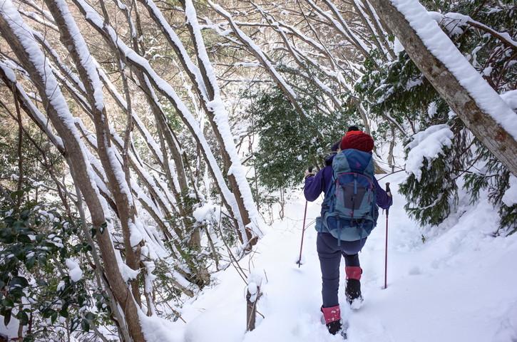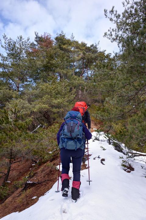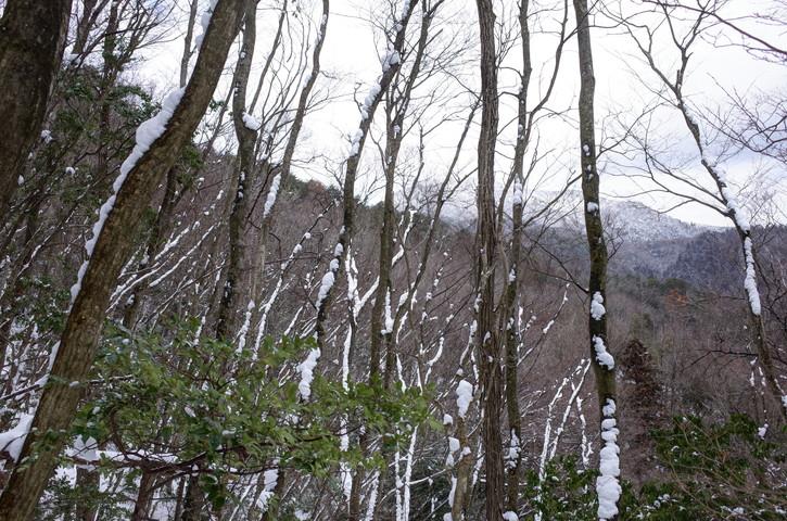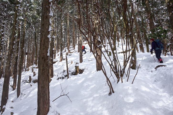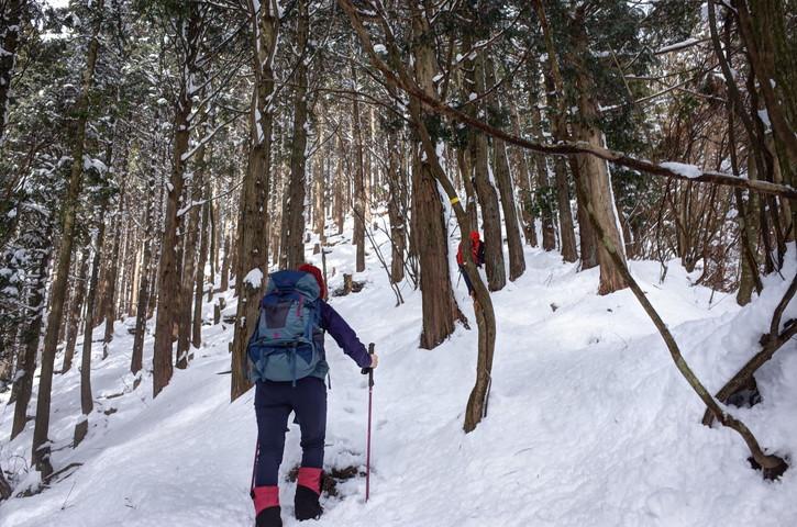 前日まで続いた寒波の影響で登山口から20cmほどの積雪です。樹林帯を30分ほど登ると広い尾根道に。尾根の木々の間からは多紀アルプスを代表する西ヶ岳、御岳、小金ヶ岳が顔をのぞかせます。