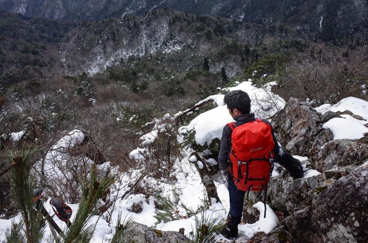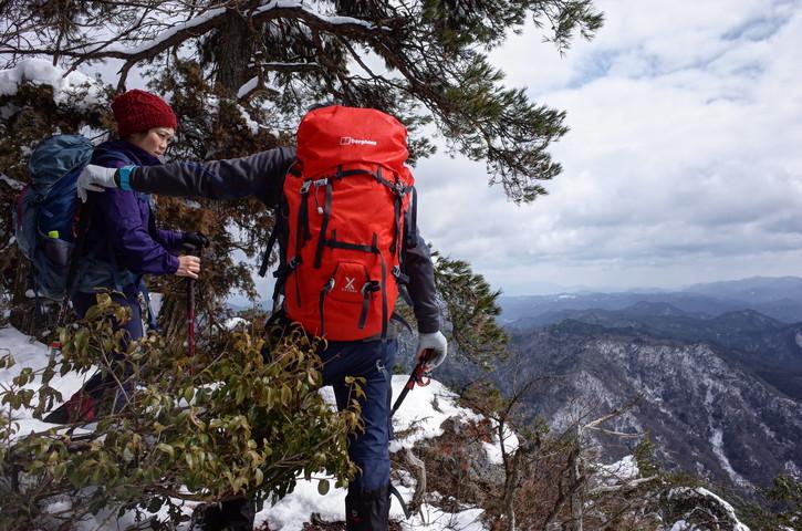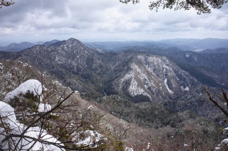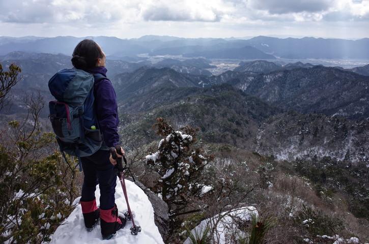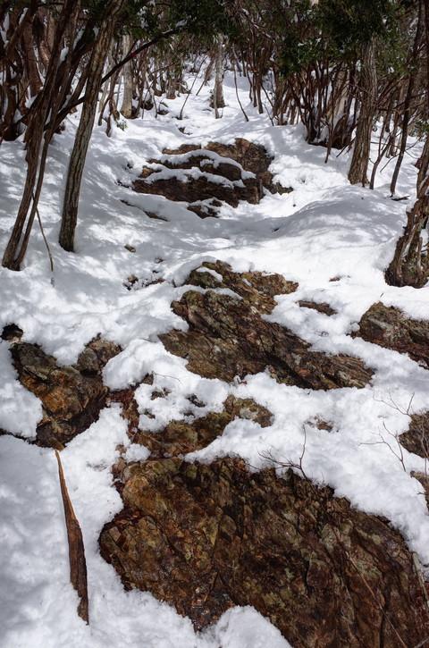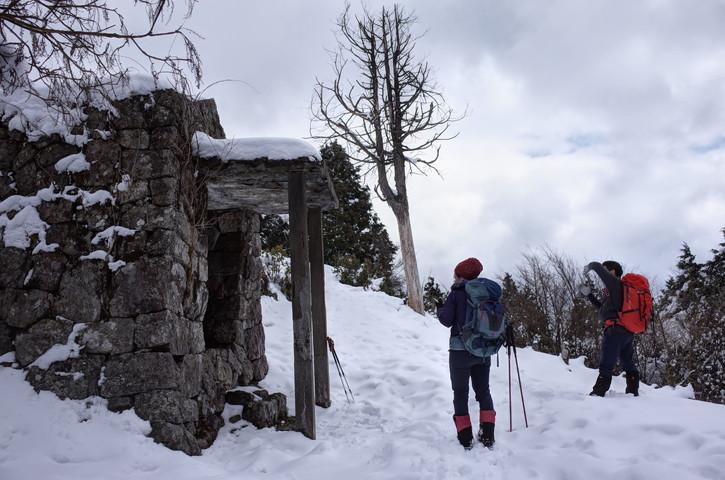 大岳寺跡をすぎると修験の山だけあって岩が次々と出てきます。雪でルートがわかりづらく大岩を登りそうになりましたが、大岩は西側を巻いて進みます。展望抜群の岩場を抜けると最後は樹林帯に。樹林帯をこえると御岳の石室と山頂につきました。