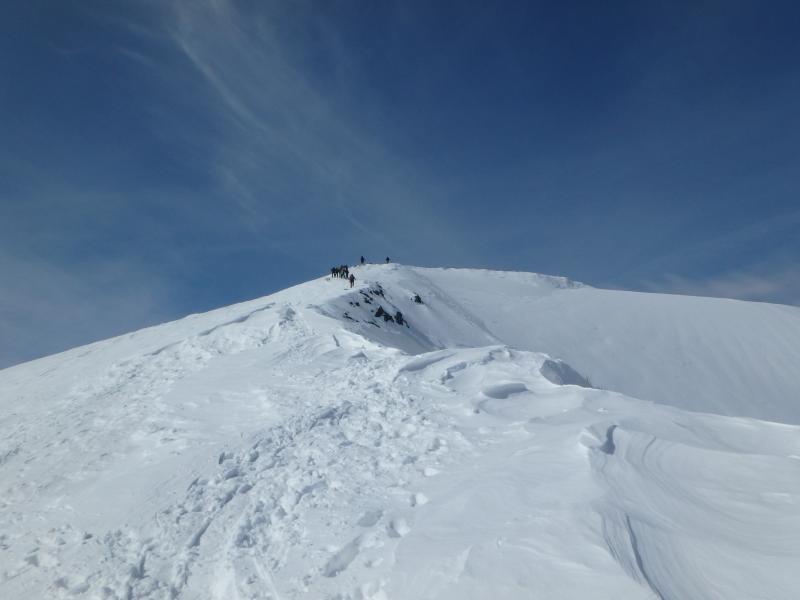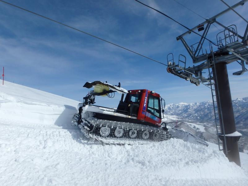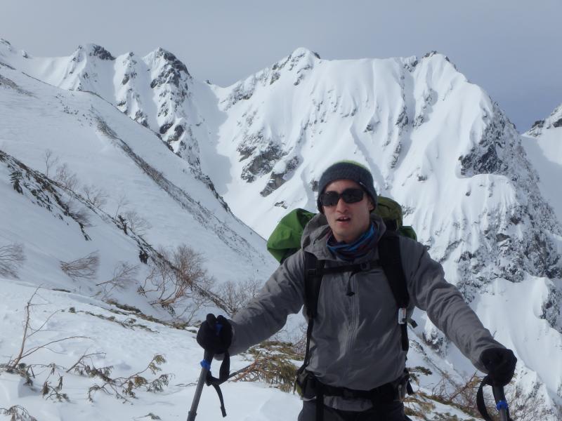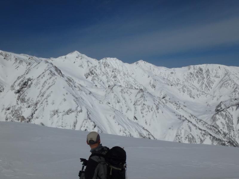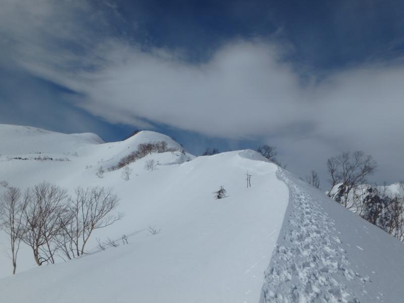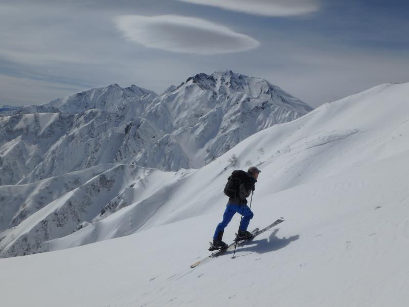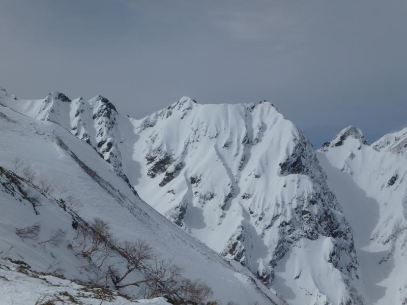 あらゆる斜面でクラックや雪崩跡が眺められ、遠く大雪渓を望むと今まさに噴煙が下へ流れている状況が見て取れました。強風を伴う大量降雪と日射、気温上昇。雪崩のリスクは依然高いようです。