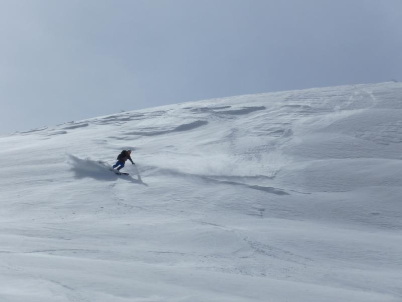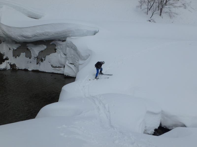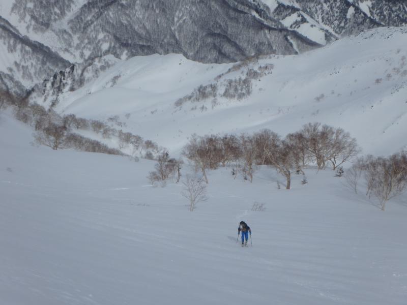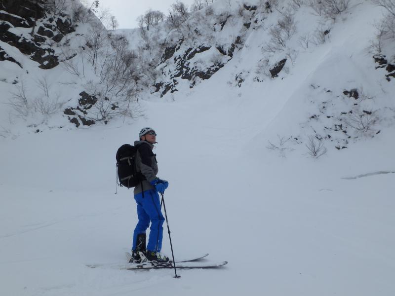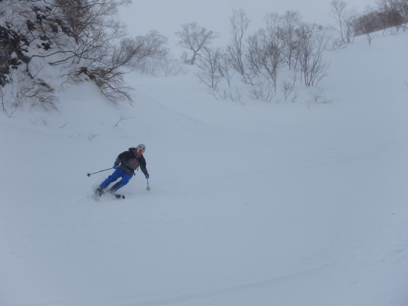 平日で入山者は少なく、BC系の方は日射の影響を受ける東~南斜面は避けて、北側のガラガラ沢周辺や無名沢を落とされたようです。我々も無名沢へ。