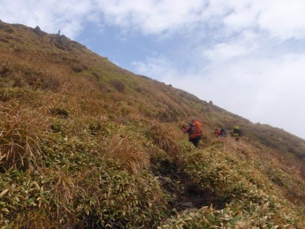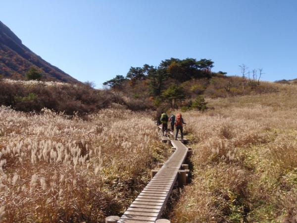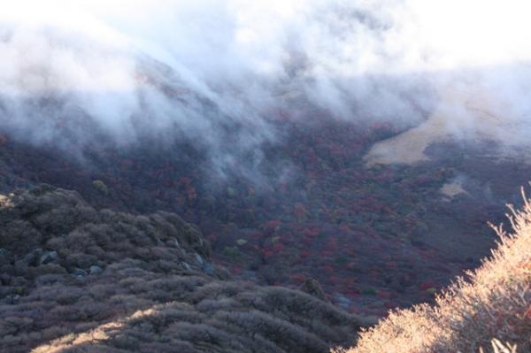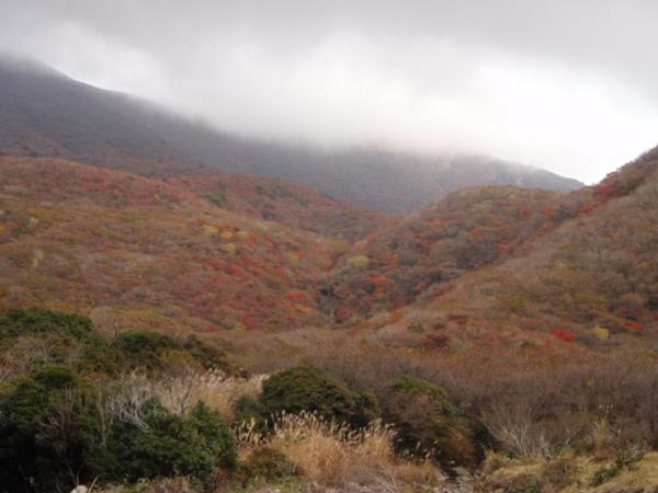 25日は、霧が出て、寒かったです。三俣山頂から霧が晴れたり、また出たりと山が見え隠れして、面白い景色が楽しめました。26日は快晴で、登山日和でした。紅葉は三俣山、大船山山頂付近は終わっており、下を見下ろすと、綺麗な紅葉が楽しめます。ボウガツルから眺めるススキと紅葉が綺麗でした。法華院温泉山荘に泊まって、のんびり登山している方も多かったです。