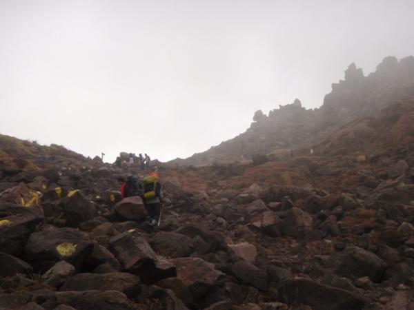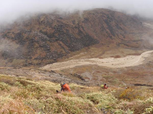- 歩きやすいルートですが、ぬかるみや、ミヤマキリシマの枝が出て狭いところがありますので、気をつけて歩いてください。気温は、10度前後なので、防寒具、雨具は必需品です。暖かい格好で出かけてください。