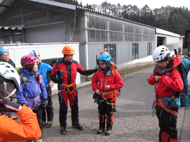 登山口でハーネスの装着やバックパックへのピッケルの取り付け方など装備を確認していざ出発!