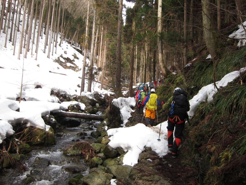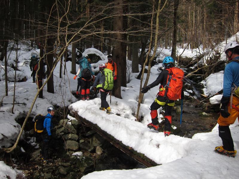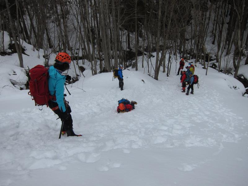 落差のある谷沿いを歩くのでアイゼンを引っ掛けて転倒しないようにご注意下さい。