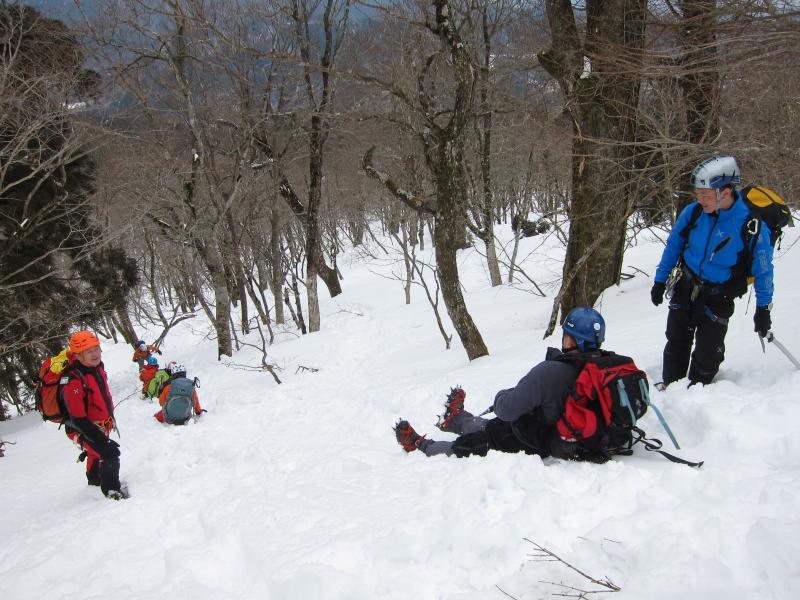 下山時、滑落停止の練習では滑って、止まって、雪まみれ、滑って、止まって、雪まみれ❆