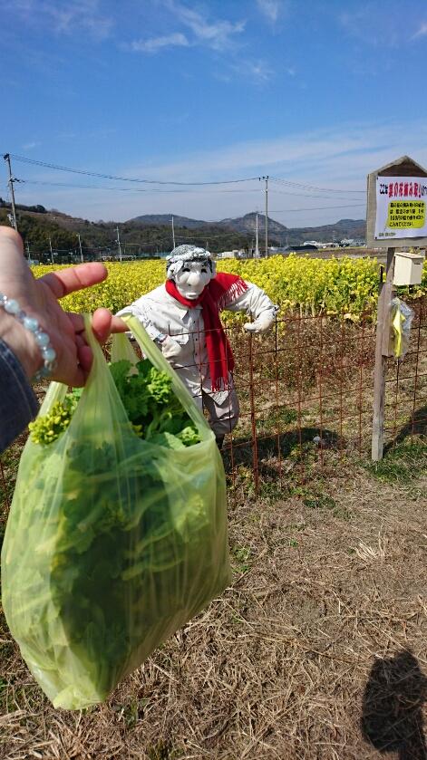 菜の花摘みは、100円で袋いっぱい積み放題。根本辺りに柔らかい蕾の茎があります。