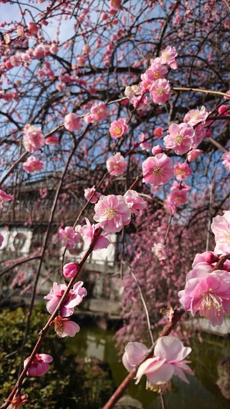 尋梅館では、何やら中国の曲が流れていました。本日はイベントのようです。建物を背景にして、立派なしだれ梅。綺麗でした~