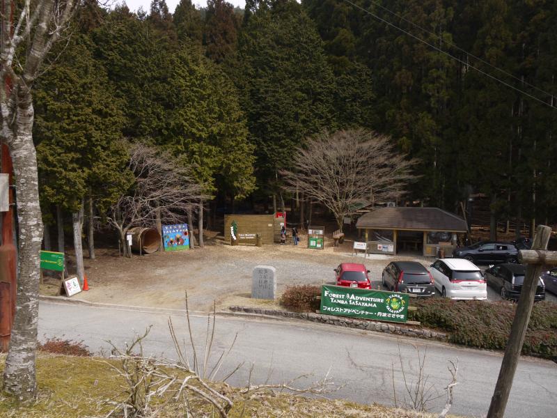 ・石室から一気に大たわに下ると駐車場に多くの車が・・・、ここのフォレストアドベンチャーには話題の遊具ジップラインがあり、にぎわっていました。