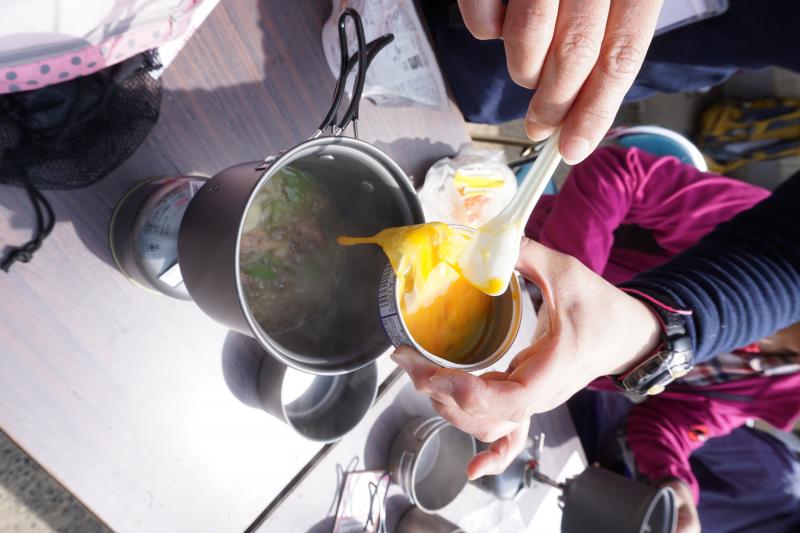 再び高根山まで戻り、森林交流館でお手洗い休憩後、お待ちかねの山ごはん調理へ。