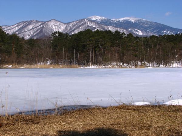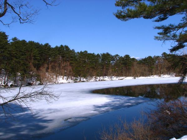 ビジターセンターの右側(トイレと反対側)から毘沙門沼に向かいましょう。雪が積もった毘沙門沼の向こうに磐梯山が望めます。沼の氷は薄いこともありますので歩けませんが。