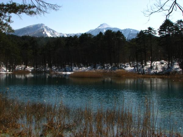 お勧め休憩ポイントはるり沼。沼の向こうに磐梯山を望み、背中側に樹木があるのでのんびりすることができますよ。