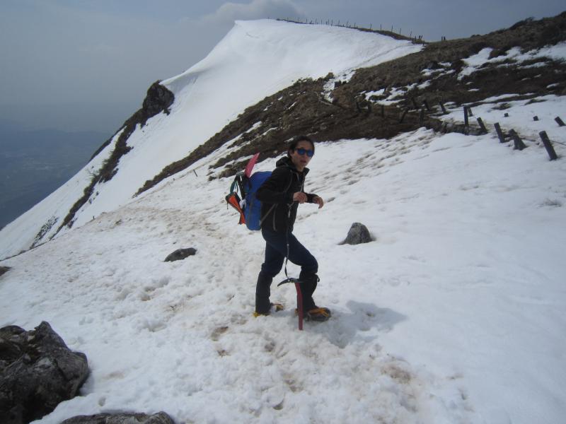 かなり緩い雪なので、逆に、アイゼンは12本、ピッケルも効きにくいですが