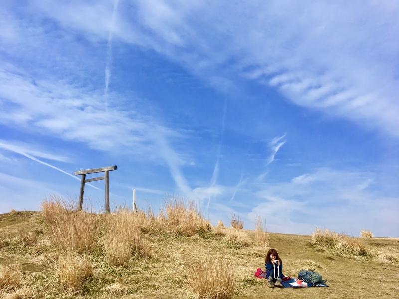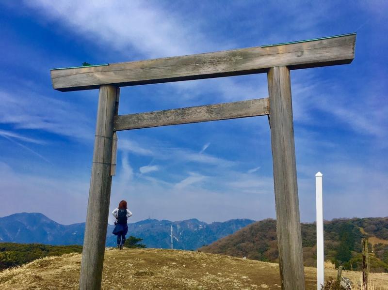 大きな鳥居のある山頂に到着。樹木のない笹原で、360度の大展望です。