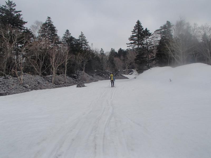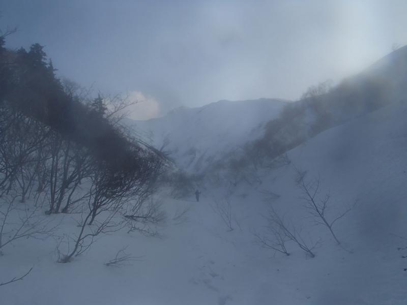 ここからは下降によく使われる北稜を下ったのですが、視界が相変わらずなく、さらに勢いを増した風はまさに爆風となり、まともに歩行もできなくなりました。20年近く冬も含めて山に登っていますがあんな風は初めてでした。何度も吹っ飛ばされ、四つん這いになって進んだ箇所もありました。予定では長官小屋に泊まるはずが、通り過ぎてしまい、風の強さで戻ることもできず、とにかく高度を下げていきました。