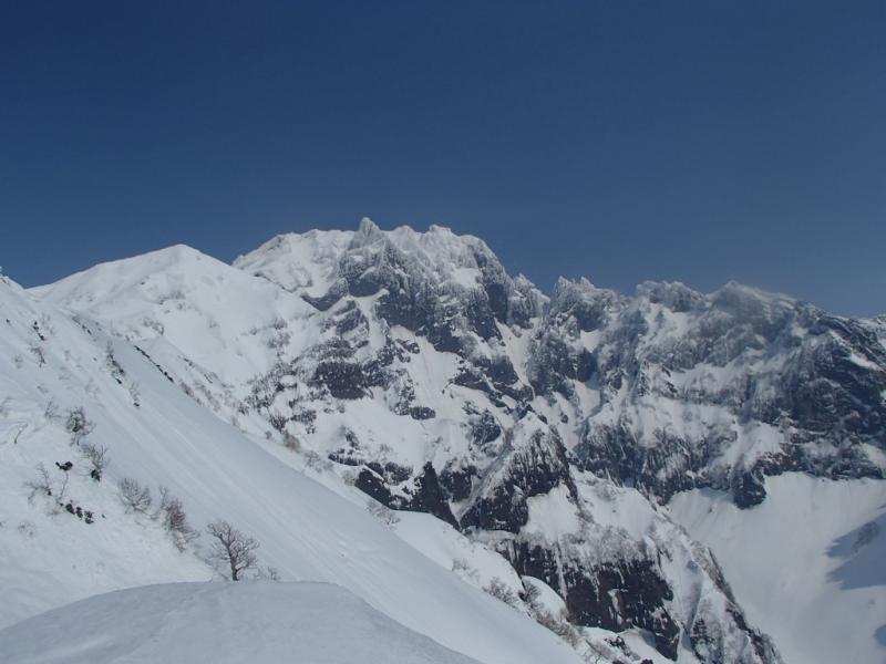 初日は快晴無風の長浜尾根を険しい岩稜が続く仙法志稜や南稜そして西壁を眺めつつ、高度を上げ、