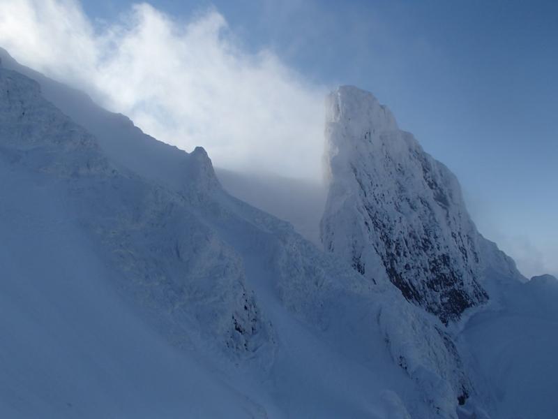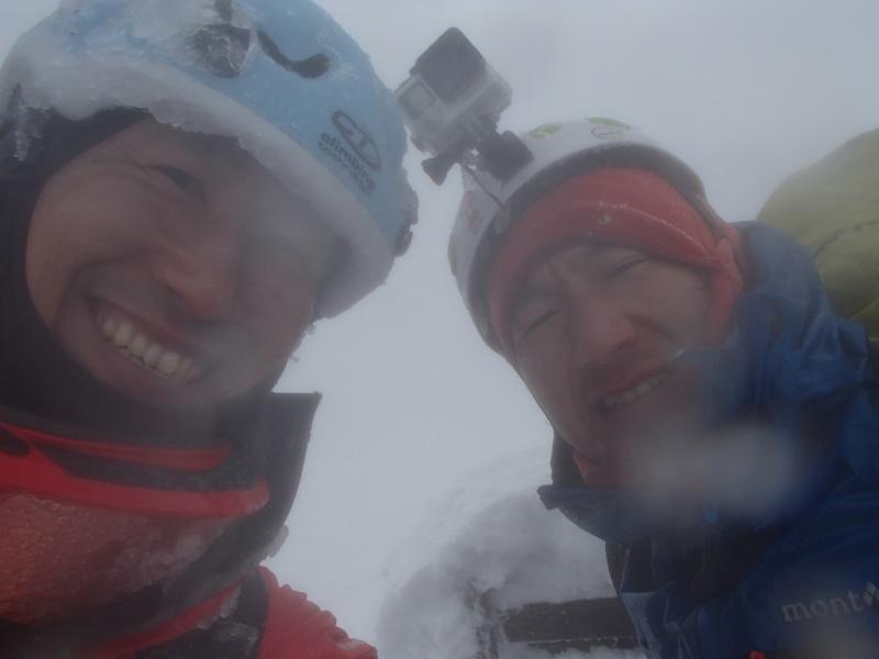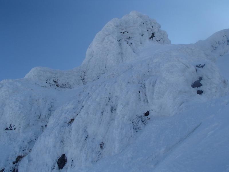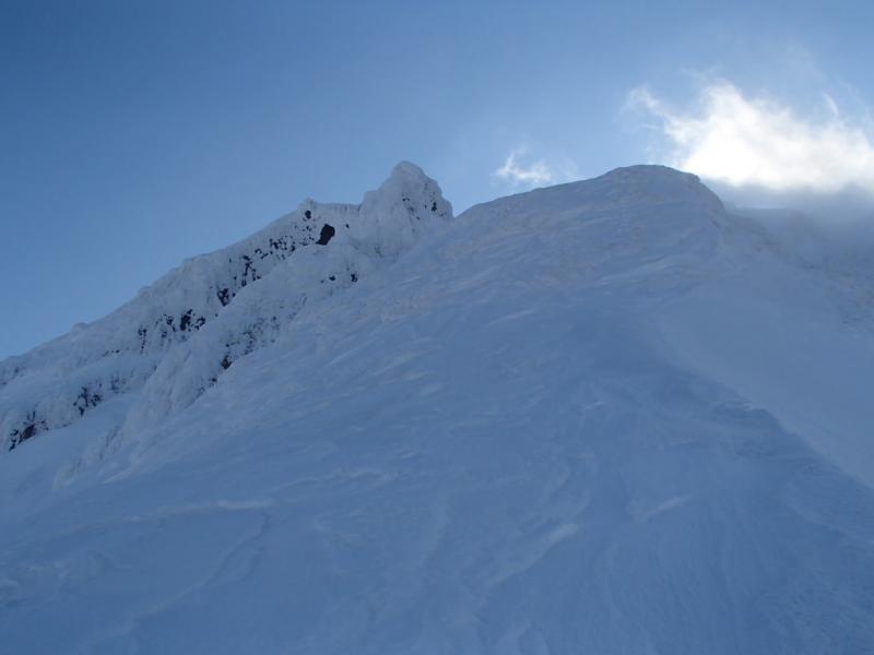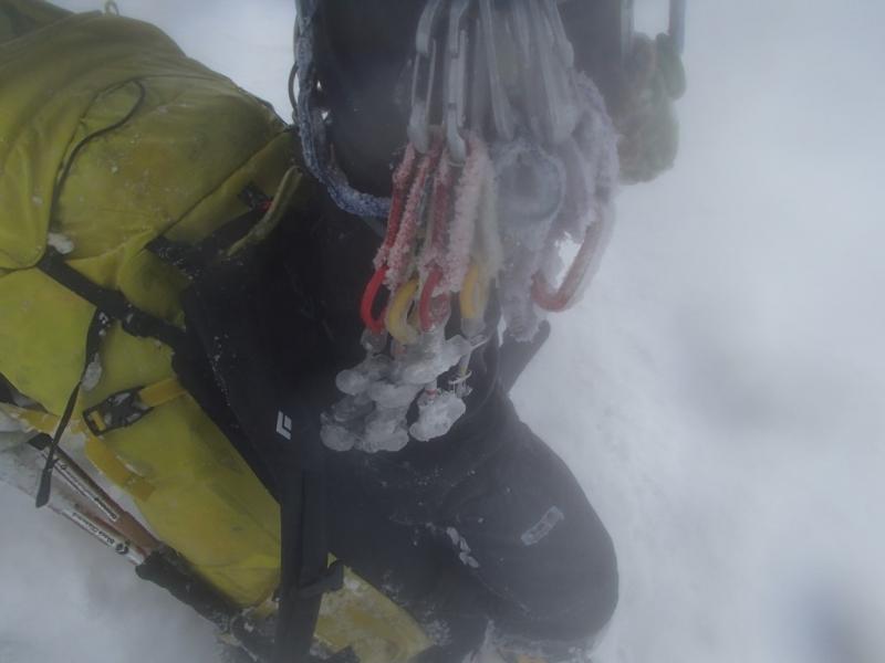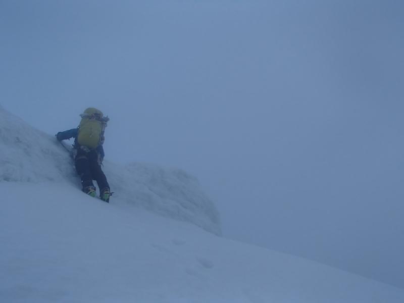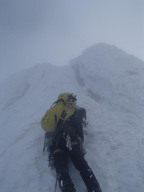 しかし、二日目は利尻本来のキビシイさを身を持って味わうことになりました。出発してまもなく視界が悪くなり、手探り状態のままダイレクトリッジへの登攀へ。プアなプロテクションと不安定な雪質に加え猛烈な除雪、細いリッジに強まる風。それでも時間が掛かりながらもなんとか抜けて頂上へ。