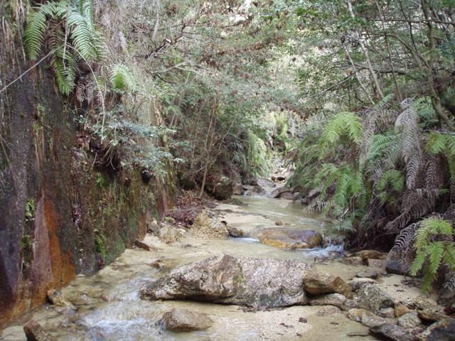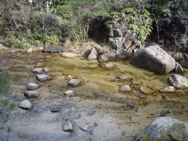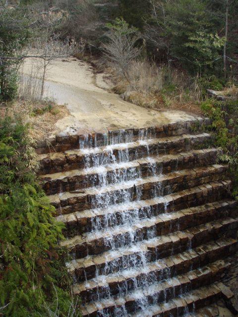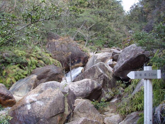 宮川道・駐車場から出発。天神川に沿ってしばらく行ったところにある、鎧ダムへの分岐から入山。飛び石伝いに川を渡るので増水時は注意。シダの茂った山道を登り、幾度となく沢を渡っていくと、鎧ダムに到着。明治時代にオランダ人の技師が作ったという石作りの砂防ダムだそうです。