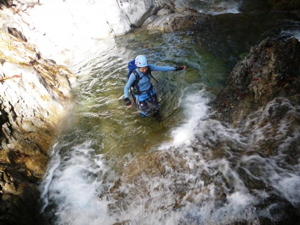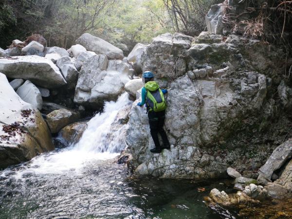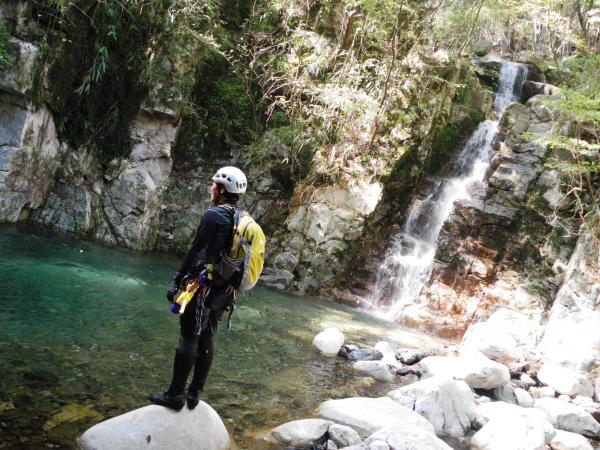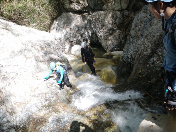 ロープを使ったのは写真の大きな滝だけなので、初心者中心のメンバーでも綺麗な水を楽しみながら沢登りが出来ますが、季節に合わせて服装は要注意です。
