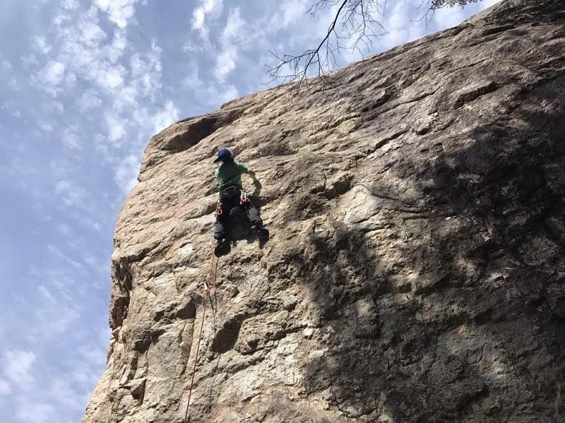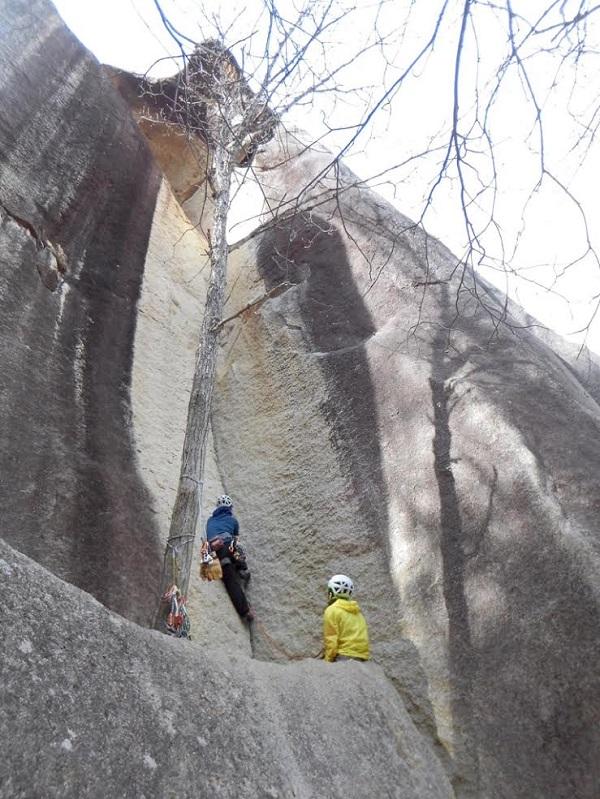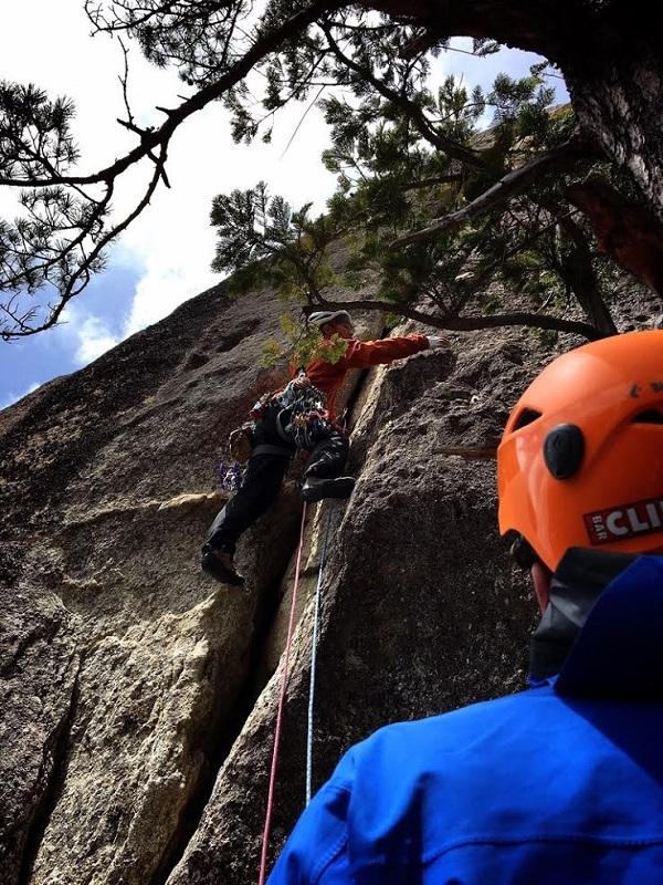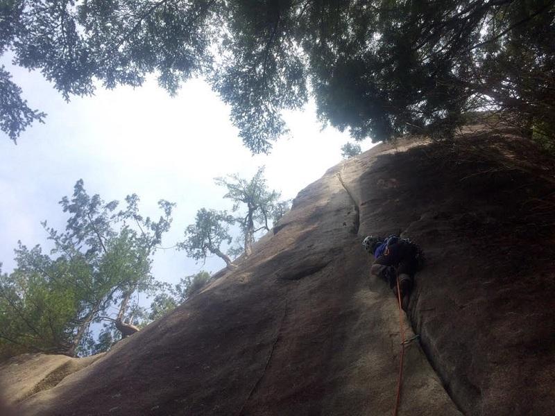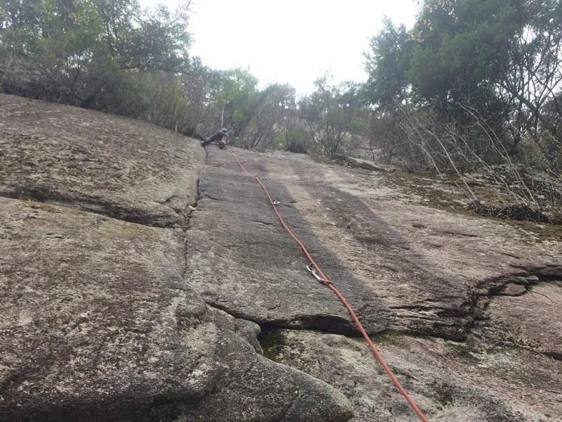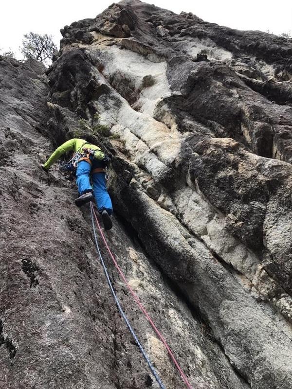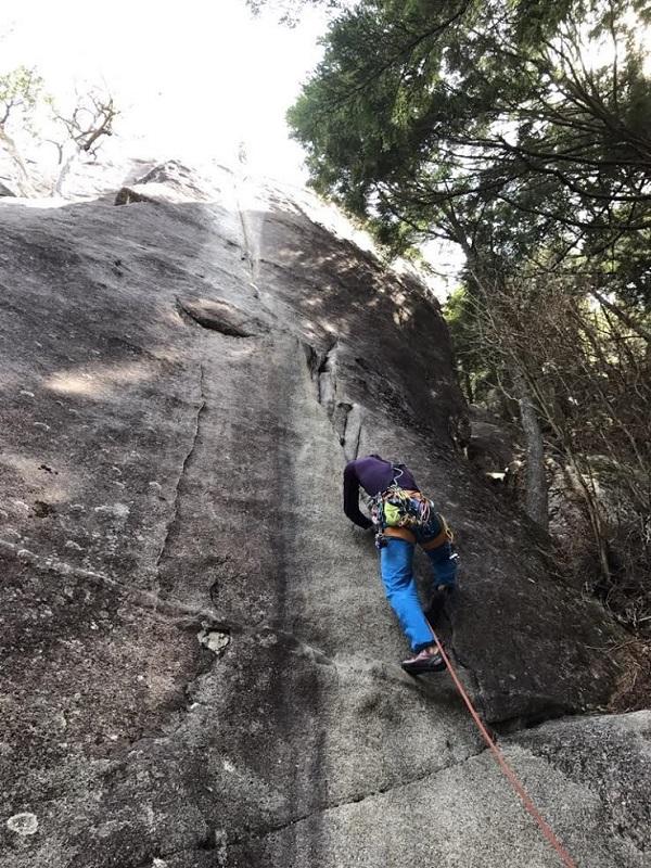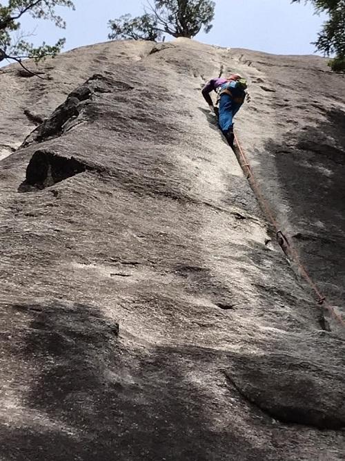 右に見えるフレークに向かってトラバース、フレークを超えたら簡単なスラブを直上し、大きな立木でピッチを切ります。フレークにカムを入れるも良し、灌木からランナーをとるも良し、距離は短く30mもないくらいでした。