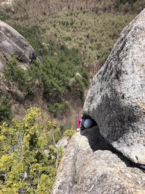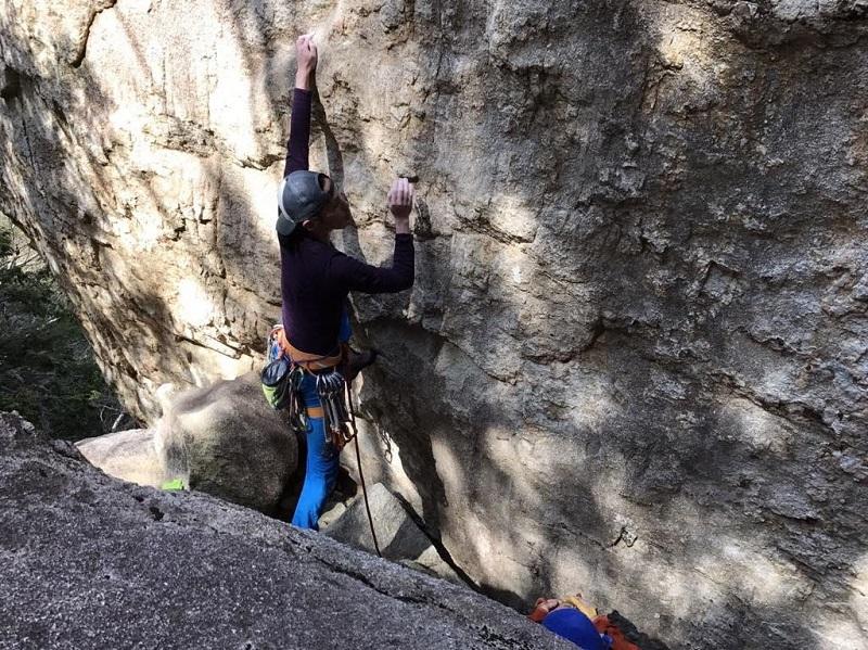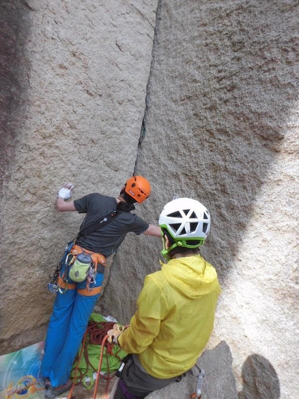 核心ピッチ。ハンド、フィストから弓状のクラックで上部はオフィズス、#3と#4を決めて上がっていました。私はフォローにも係わらず、人工でしか抜けれませんでした。ペツルのハンガーでピッチを切ります。普段ワイドをしない人にはほんと核心になります。
