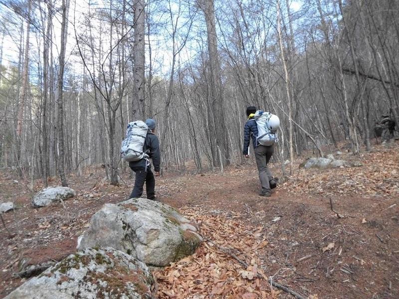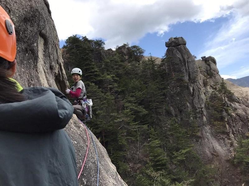 歩きです。15mほど歩くと目の前に岩峰が現れ、コル上になっていて立木に懸垂の残置支点があります。岩峰も登れるようですが、今回はここで降りました。懸垂は2回、下も立木が支点。向かって右方向のルンゼに吸い込まれるように降りました。