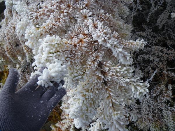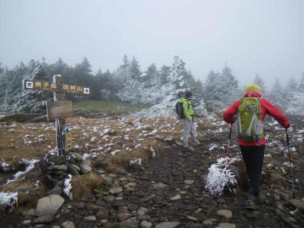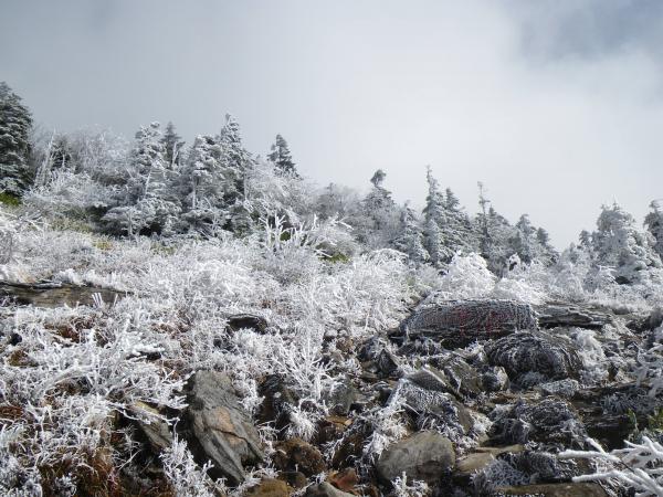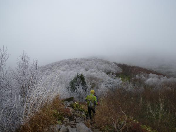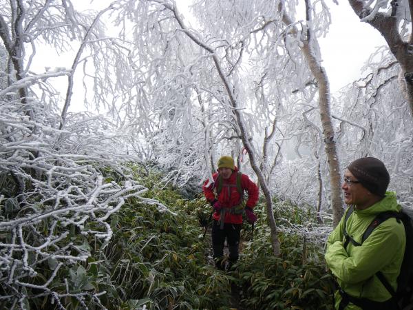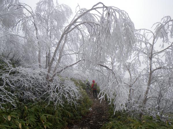 ガスの切れ間に見える上の景色が白かったので、何かと思ったら…すでに霧氷の木々になってました。