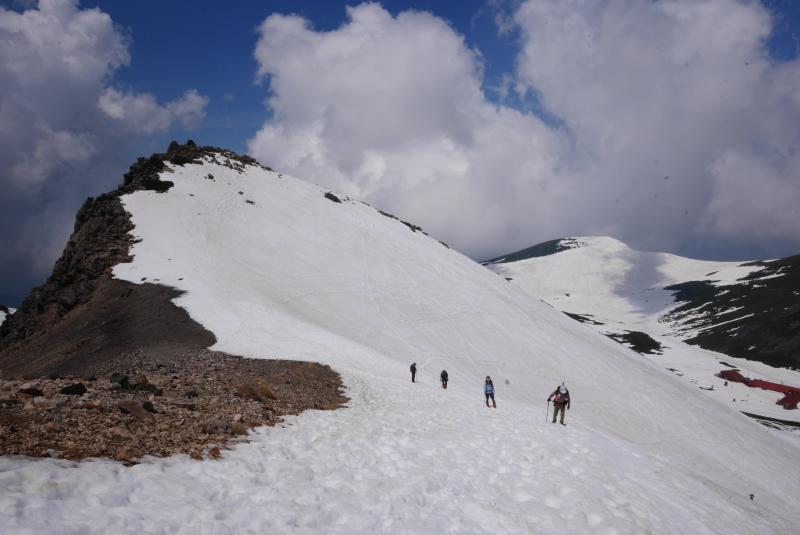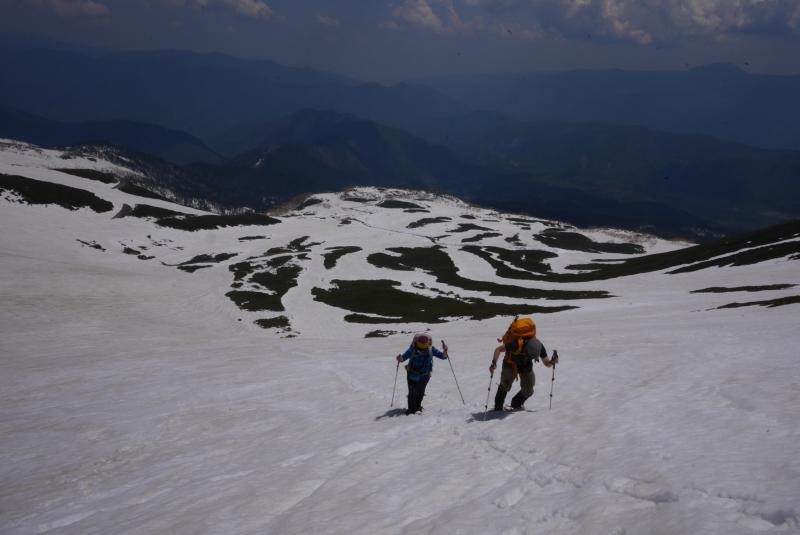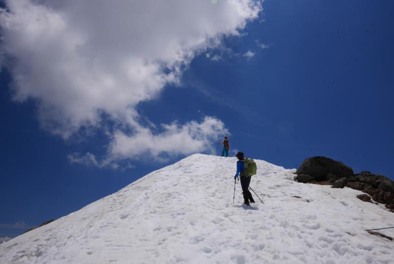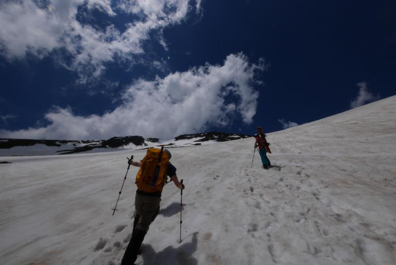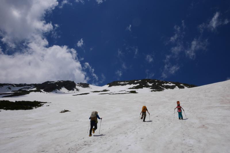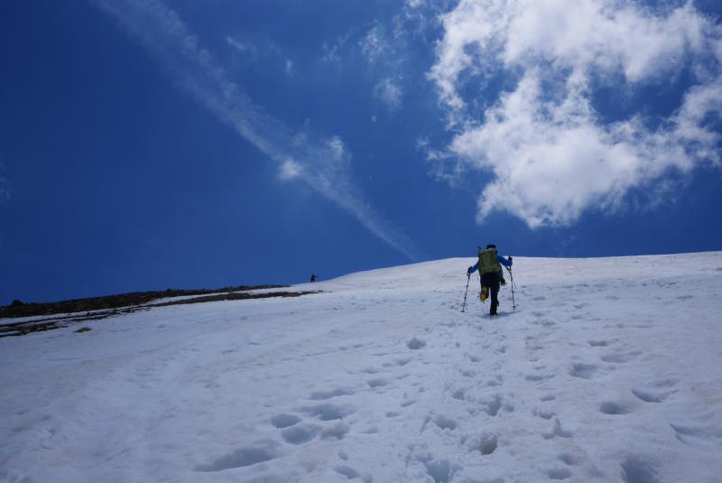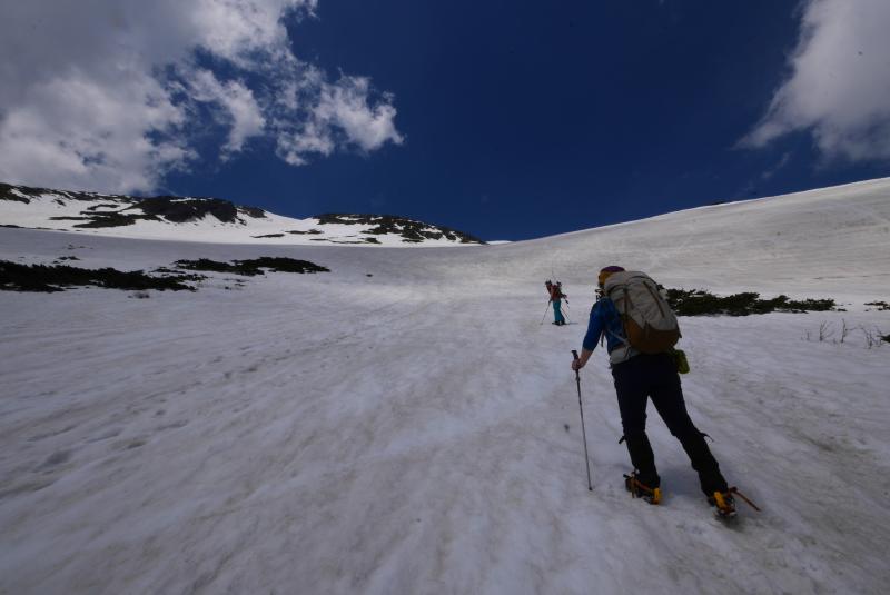 除雪の関係でバスは位ヶ原山荘までしか行きませんでしたが、毎年雪の状況によって異なるので事前に確認必須です。この日は午後が雨予報。登りはじめの天気は晴天で気温も高く、歩いていると暑かったのですが日焼け対策のネックゲーターは恐ろしくて外せなかったです。翌日みんなけっこう顔が赤くなっていましたから。