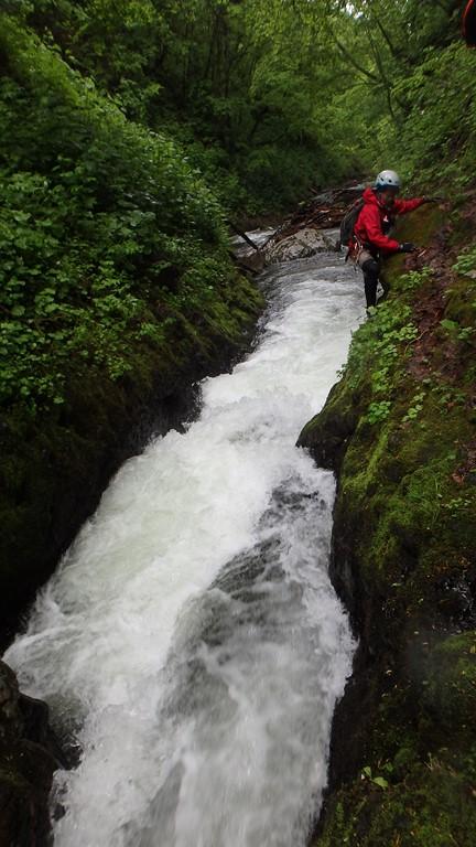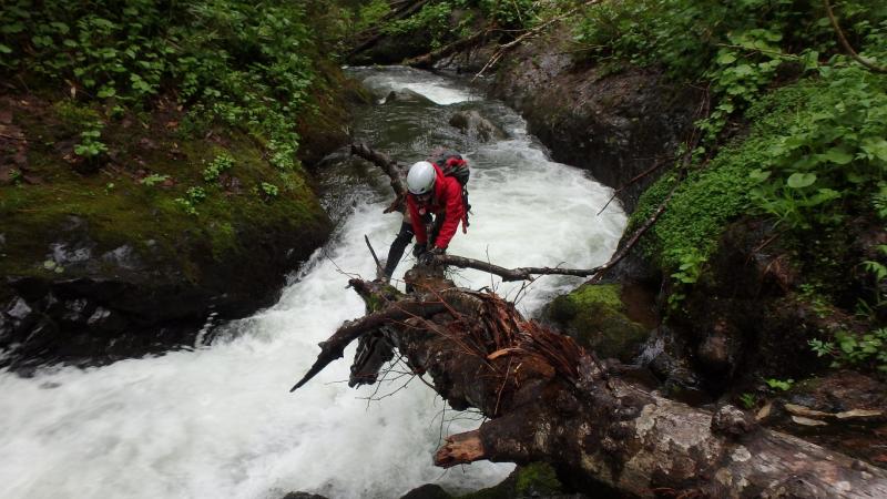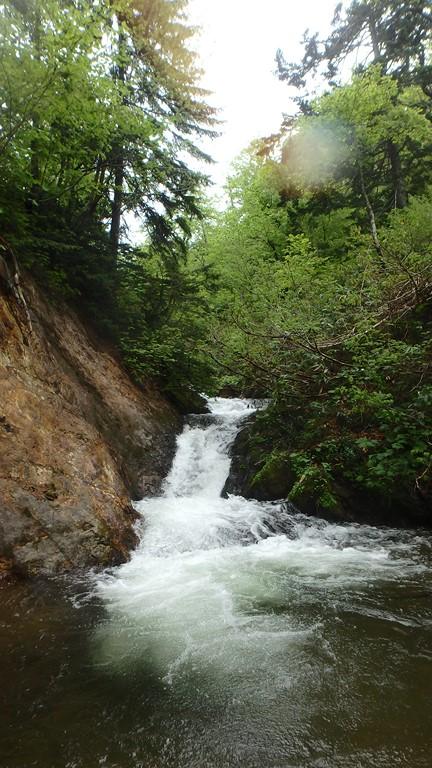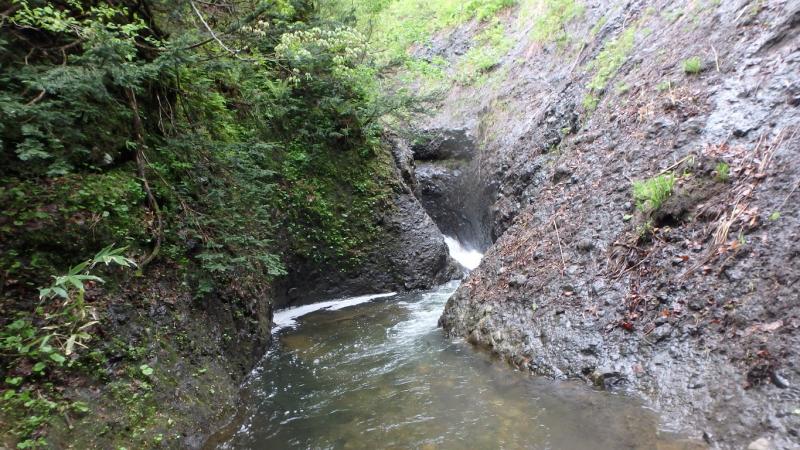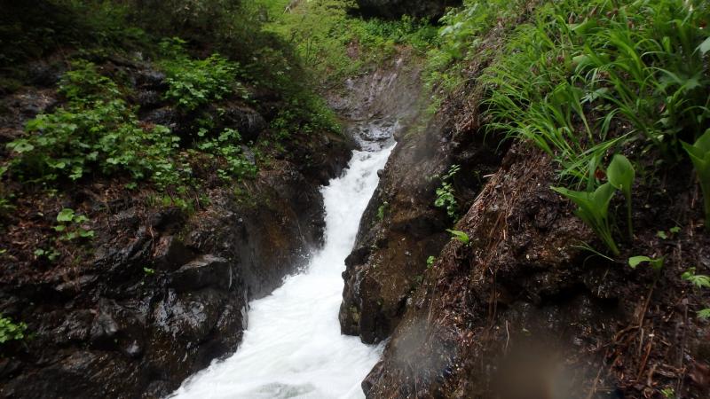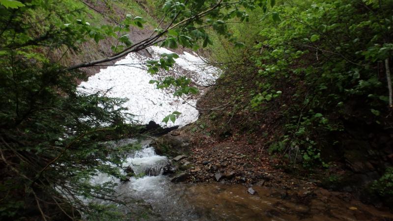 - 前日からの雨で水量多め。440m二股の先に大きめの雪渓が二つ有り。通過困難ではありませんが、今年は雪解けが遅いかも?