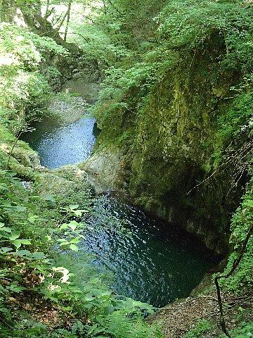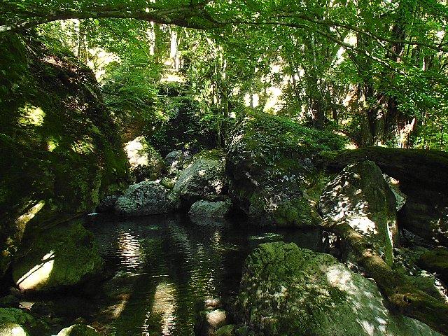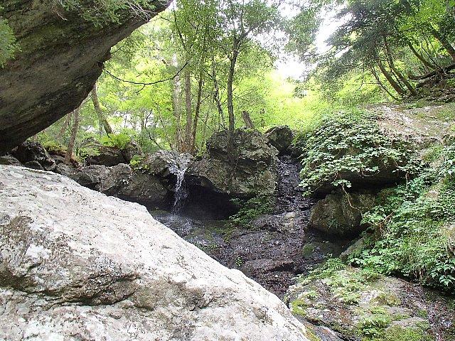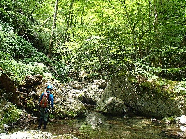 天気も良くブナを中心にした広葉樹の木漏れ日に包まれ、沢には透明度の高い流れと緑の苔に覆われています。苔の間から小さな黄色や白の花が咲いていました。