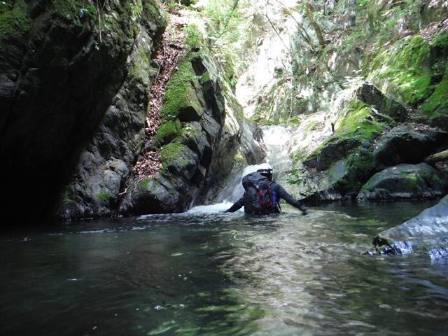 ここでゴルジュ突破。少し穏やかになった渓相楽しみながら進むことしばらく第二ゴルジュに入ります。