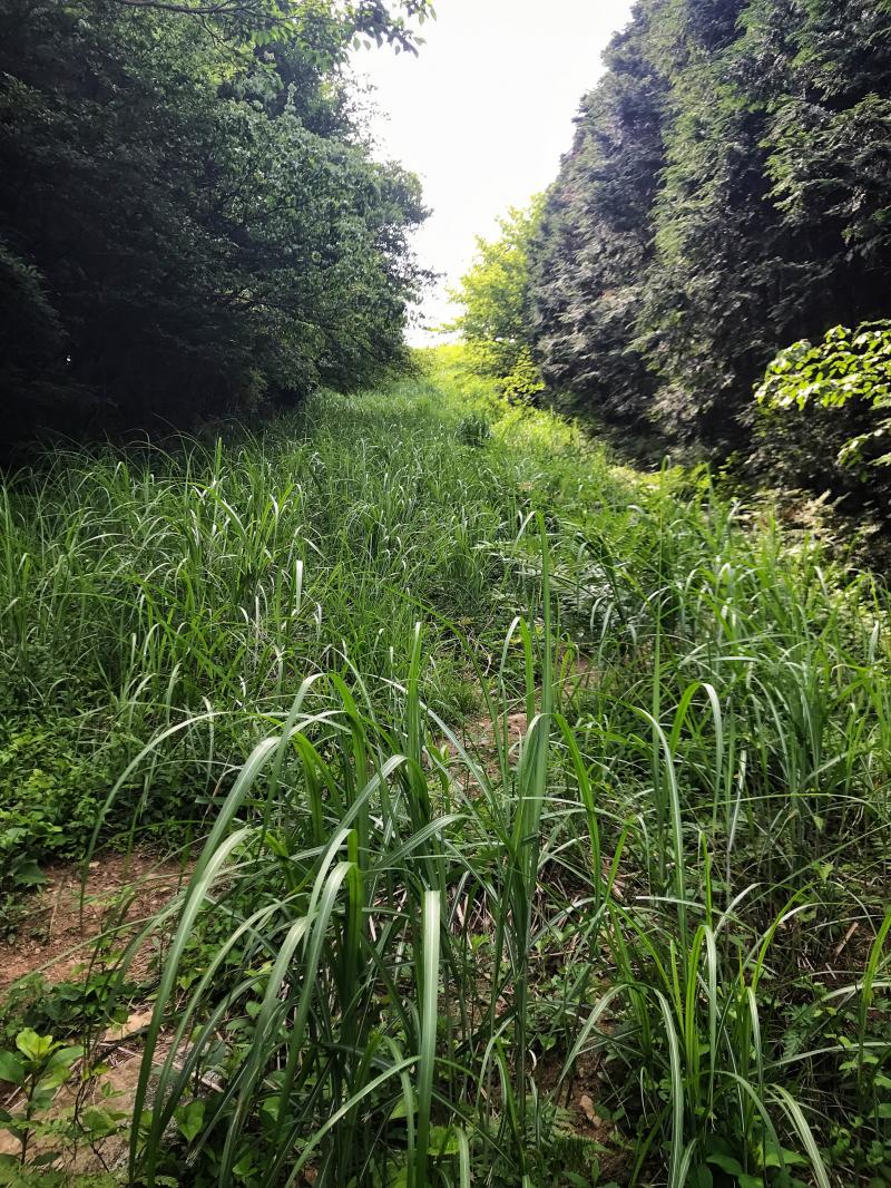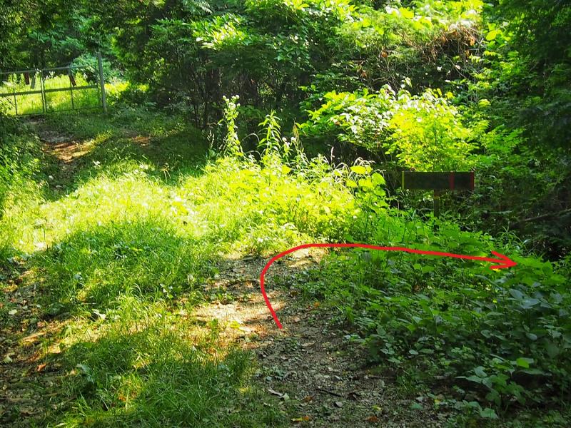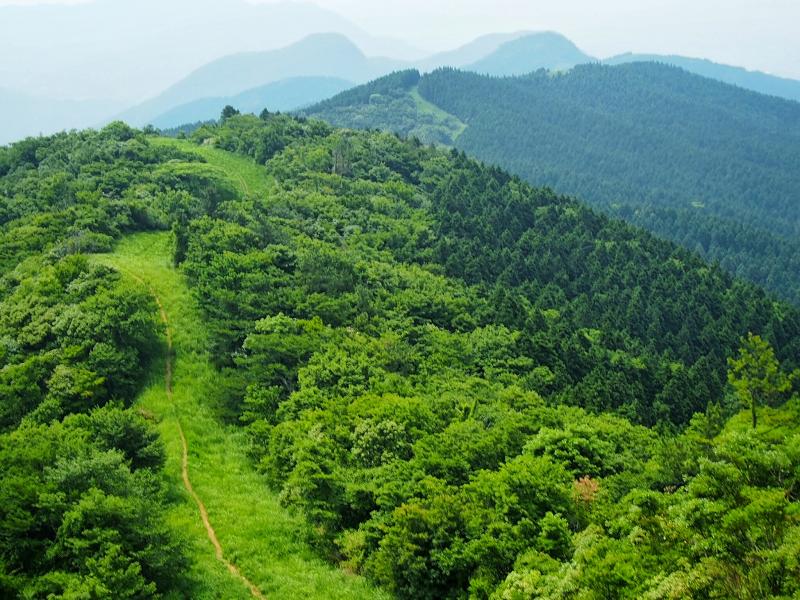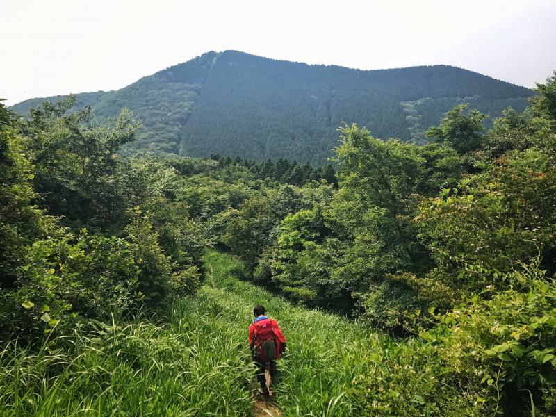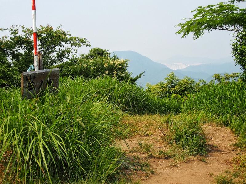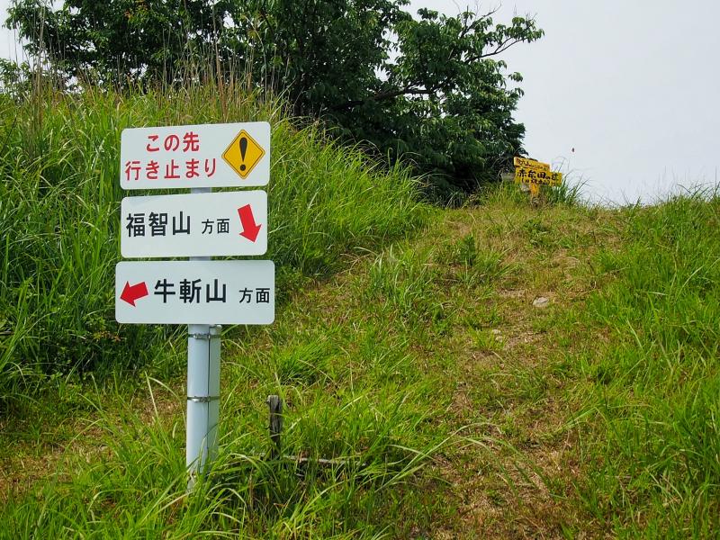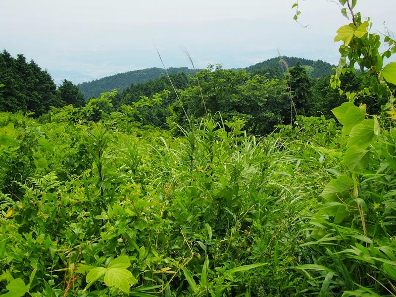 ここまで来ると牛斬山も香春岳も頭が見えていて射程範囲です。赤牟田ノ辻からしばらくの下りはザレて滑りやすい箇所もありますが、引き続き見た目は爽快な縦走路を進みます。途中、鮎返新道分岐に差し掛かりますが、盛夏になりつつある気候で茂っている脇の分岐路は道標ごとヤブの中。薮屋さんでない限り、しばらく誰も利用しないでしょう。