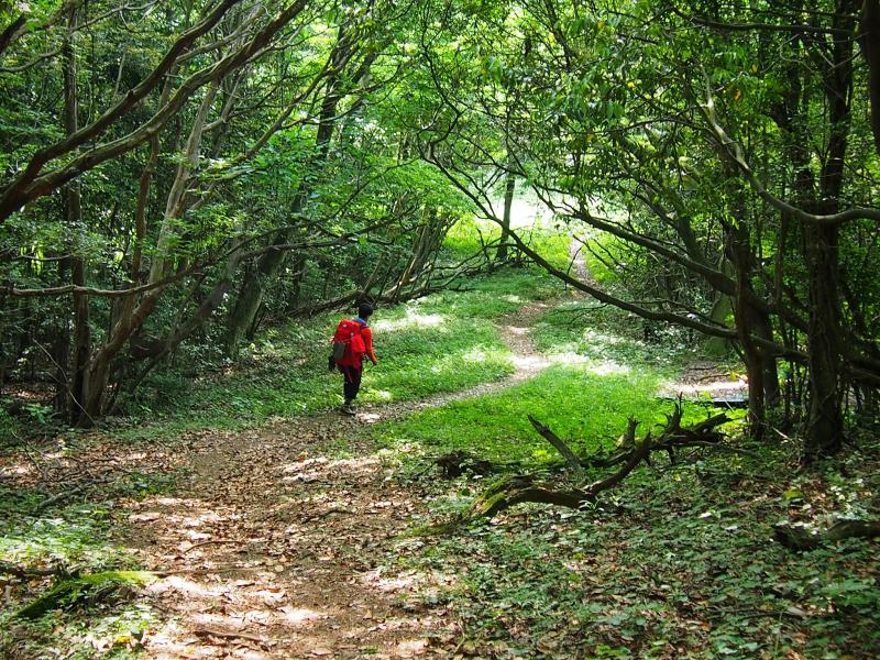 念仏坂直前のコルは木漏れ日と緑が綺麗な広葉樹林に囲まれた天然の回廊、まるで嵐の前の静けさ的な印象を受けつつ念仏坂に突入。九州自然歩道と比べると足元は少し悪くなりますが、足の置き場を吟味しつつ出来るだけ小股で九十九折を自分のペースで登っていきます。コルからの標高差は150m程と少ないものの、やはり問題の斜度は平均して40°~45°くらいで続く模様。