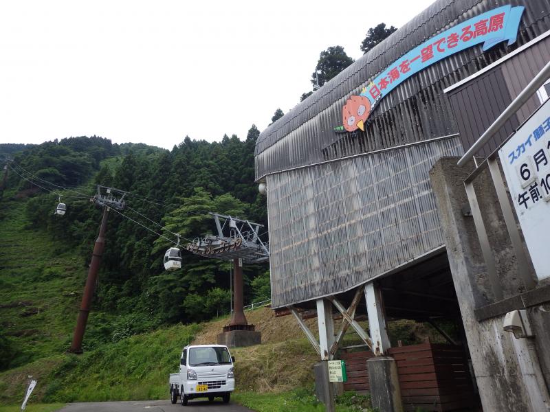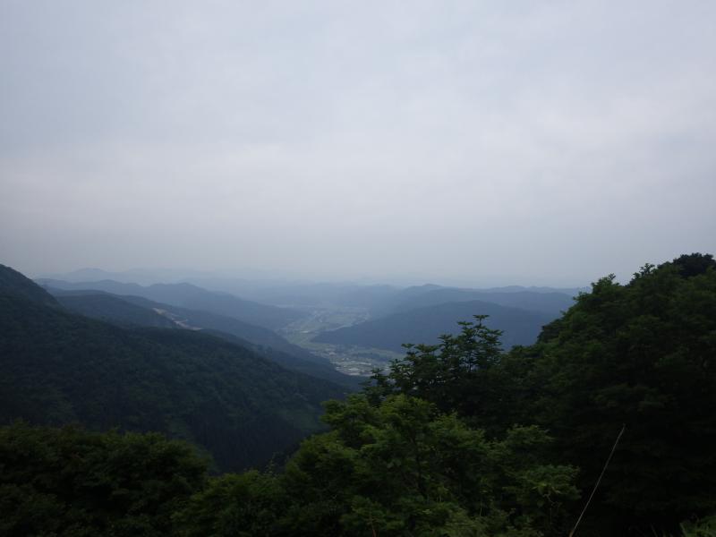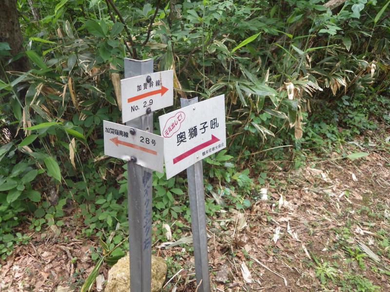 登山者はパーク奥獅子吼の第3駐車場に車を止める。ゴンドラをくぐって登山口に取り付く。今日の登山ではここから月惜峠が一番キツかった。ジグザグとした延々と続く登りだ。足場は悪くないがひたすら続く急坂にすぐに汗をかき始める。杉の植林地から広葉樹林に変わったころ突然月惜峠に出た。ここで右。ここからは緩やかな登山道となり、しばらくすると右側が開けた尾根歩きとなった。手取川とその街並みが見えるが遠くの展望はもやってしまっていてなし。気持のいい尾根歩きを満喫していると林道に出くわす。この林道脇にも車が数台止められるようになっており、ここまで上がってしまえば1時間足らずで山頂に行ける。
