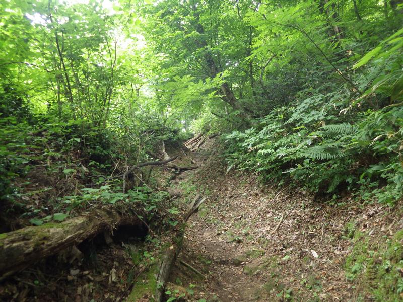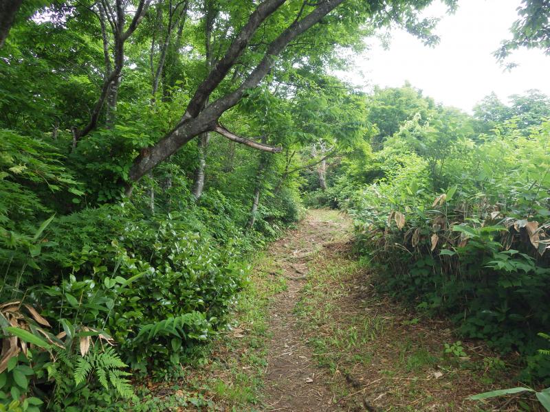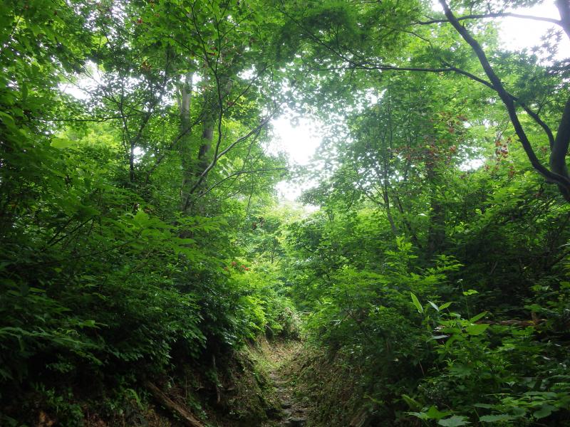 林道を横切ったあともゆったりとした登りが板尾方面の分岐まで続く。新緑まぶしく、所々覗く青空や遠くの展望が気持ちいい。