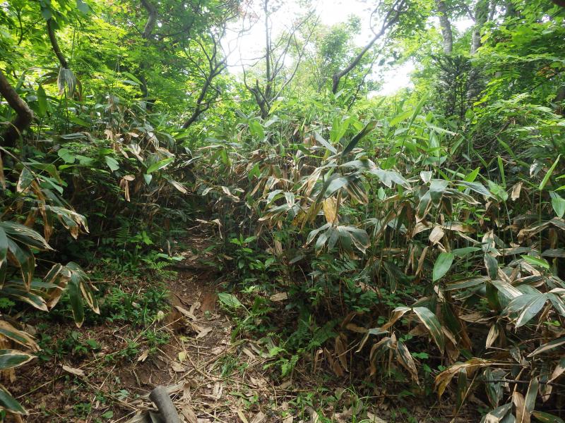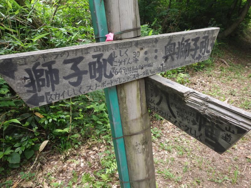 そんなお話を聞きつつ、ほかの山々の情報を集めつつ。のんびりと休憩をしていたら1時間以上経っていた。そろそろ下山だ。実は分県ガイドには樹木公園方面に下山するルートが紹介されていたが、先ほど通った分岐から見た登山道が笹に覆われていて完全藪漕ぎ状態に思われたので素直にピストンでパーク獅子吼に下った。