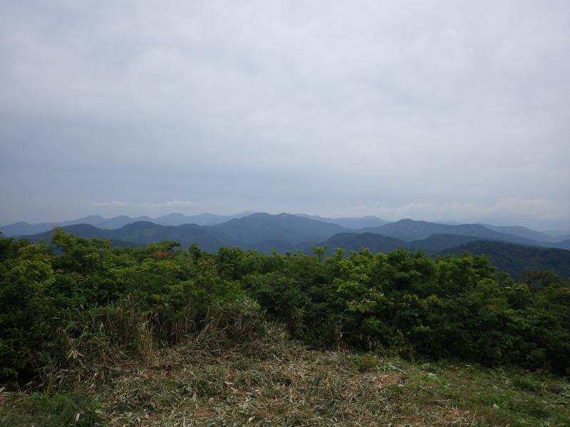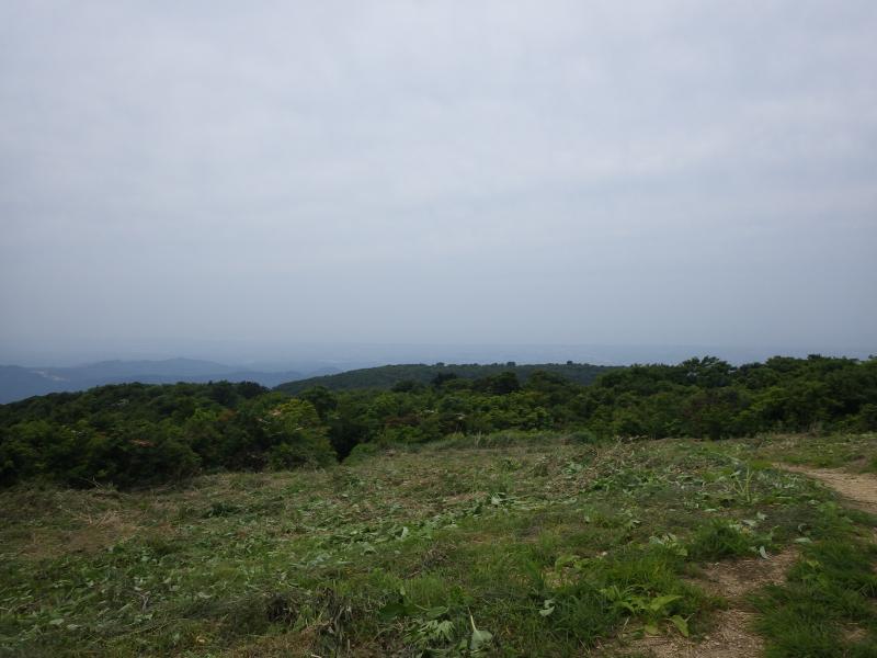 板尾分岐を過ぎると最後の登りだ。登山道の両脇の草や木々が刈り取られたあとがあり非常に歩きやすくなっていた。ここらへんの登山道の両脇に春にはカタクリが咲き乱れるらしい。そしてとても広く開けた山頂に到着!360度の展望だ。が、今日はもやっていて遠く白山ははっきり見えなかった。日本海のと空の堺もボンヤリ。でもこの展望とこの広さ、なんとも言えない贅沢だ。