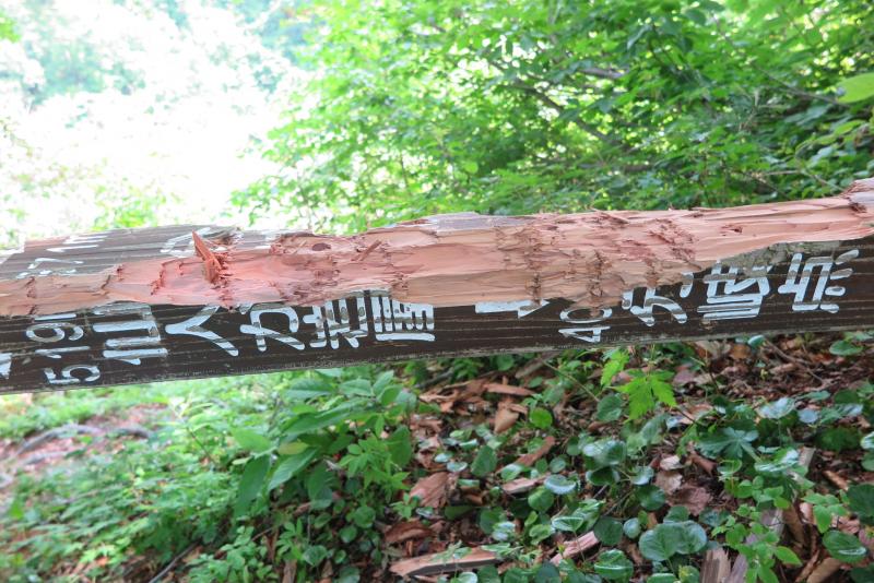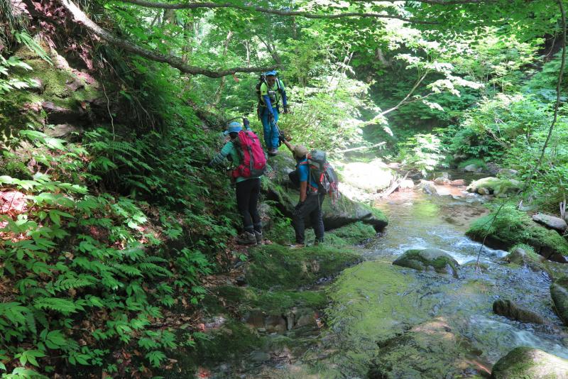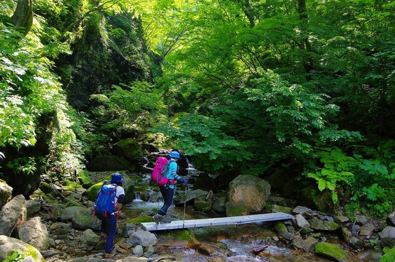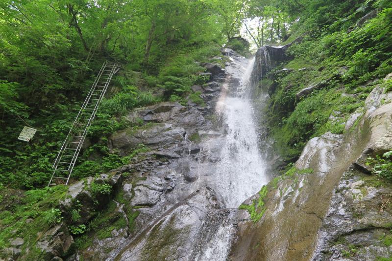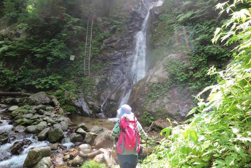 今回はマイナスイオンたっぷりの西側、越沢(こえざわ)登山口から。小国川に沿って登山道が始まり、序盤で対岸の見事な岩峰、鵜ノ巣ノ倉とカジ倉の見所があります。橋を渡ると徐々に滑り易くなり、滝までは気の抜けない道となります。弁財天の滝は一見の価値あり。左手の梯子から登山道が再開しますが丈夫なのでご安心。滝を越えると山頂までずっと急登、風が無く蒸し暑かったです。ガイドブックには下山ルートとして書かれていましたが、かなり急なので登りの方が安全だと思います。