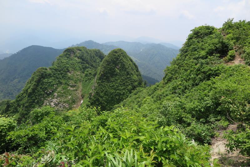 山頂からは東側の奇峰群が見渡せます。屈強そうなヘルメット部隊がそちらから登ってきましたが、かなり興味深いです。いつか挑戦してみたいものです。以東や障子、月山が遠望できるはずですが、空気がモヤモヤしてて判別し辛かったです、残念。