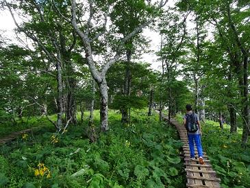 山頂手前の木道にはマルバダケブキがきれいに咲いており、最後の一頑張りにエネルギーをくれます!