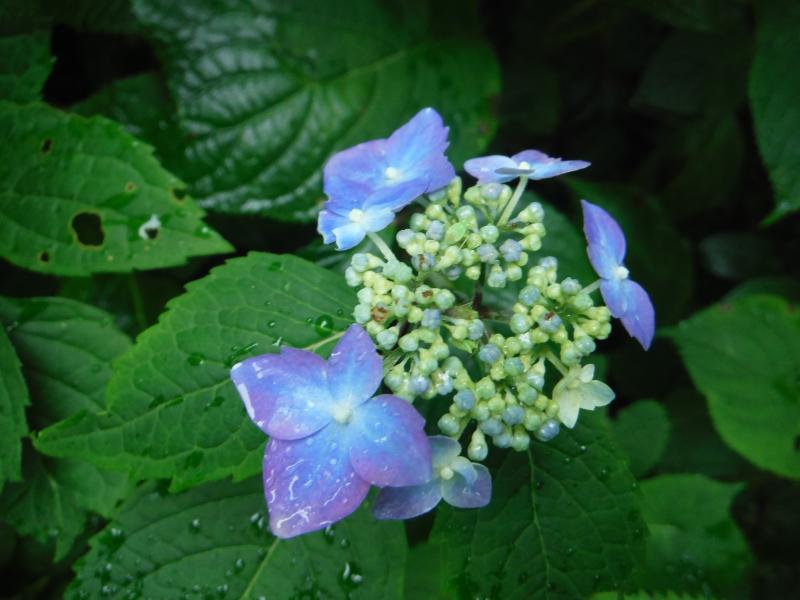 いつも通り神社にお参りしてスタート。しかし連日の猛暑で夏バテしたせいか登り始めは調子が悪くバテバテ。さらに雨も降ってきたし帰ろうか迷いながら避難小屋の辺りをうろうろしていたら、つややかに濡れて色鮮やかな紫陽花を発見。写真を撮ったりしてしばらく過ごしていると次第に雨が止み、気分も落ち着いてきたのでもう少し頑張ることに。