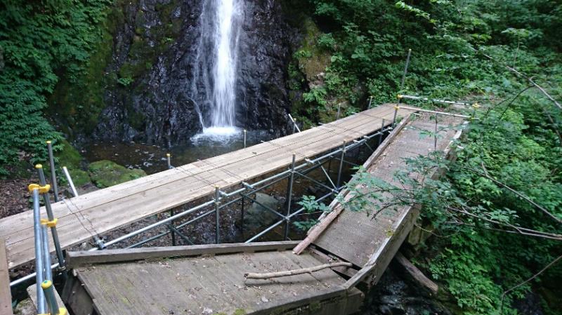 観光客も多い天滝は、滑落防止に沢側に柵が付けられているのですが、久々に歩いてみると結構壊れていました。道幅はそこまで狭くはないですが、ついつい滝を見ようと体を乗り出したりすると危険なので、足元要注意です。
