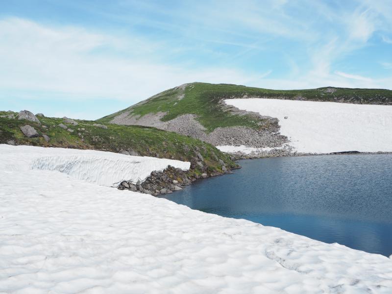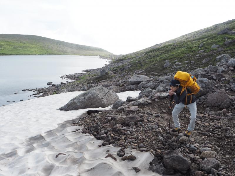 その後はコースに点在する沼や池塘、残雪を横目に稜線歩きを楽しみます。