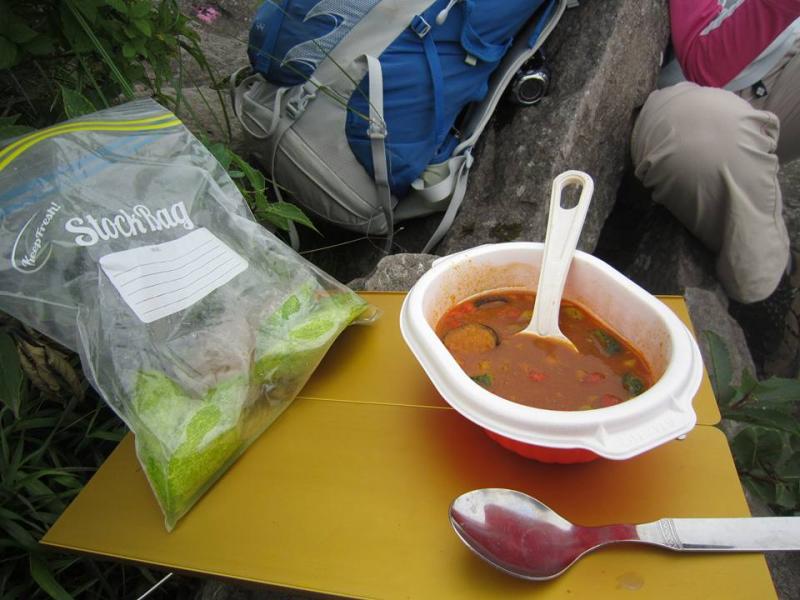 象が鼻 (1550)を越えた岩場で お昼にしました。ガスが晴れ 三鈷峰も見え