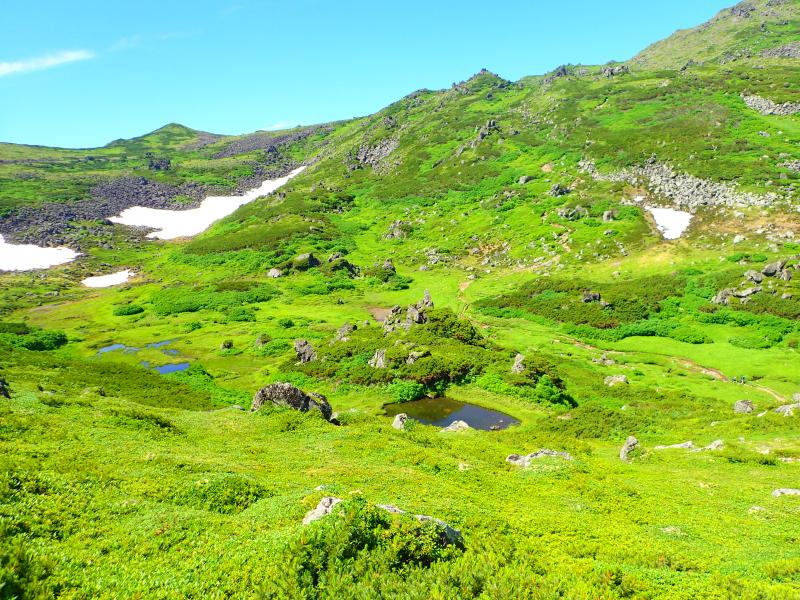 ②南沼キャンプ指定地(30分)トムラウシ山(90分)北沼(180分)化雲岳(90分)五色岳(60分)忠別岳キャンプ指定地(泊)
