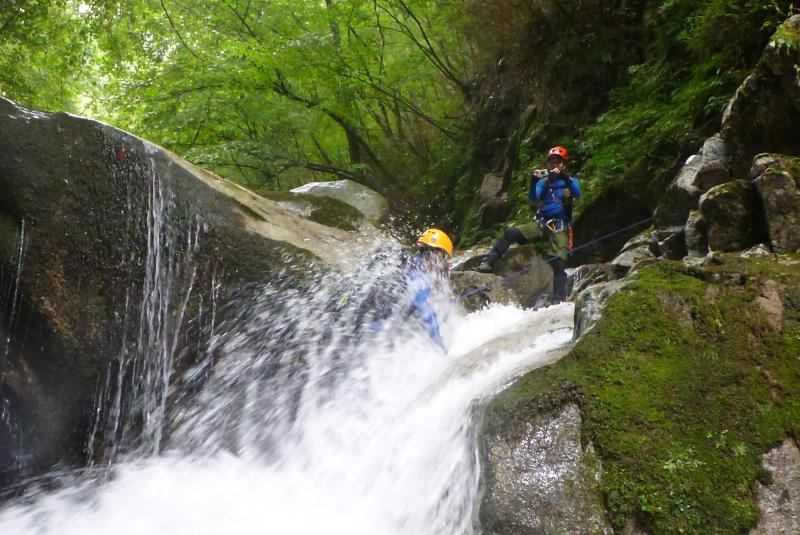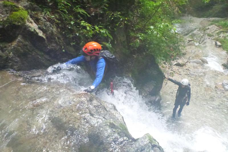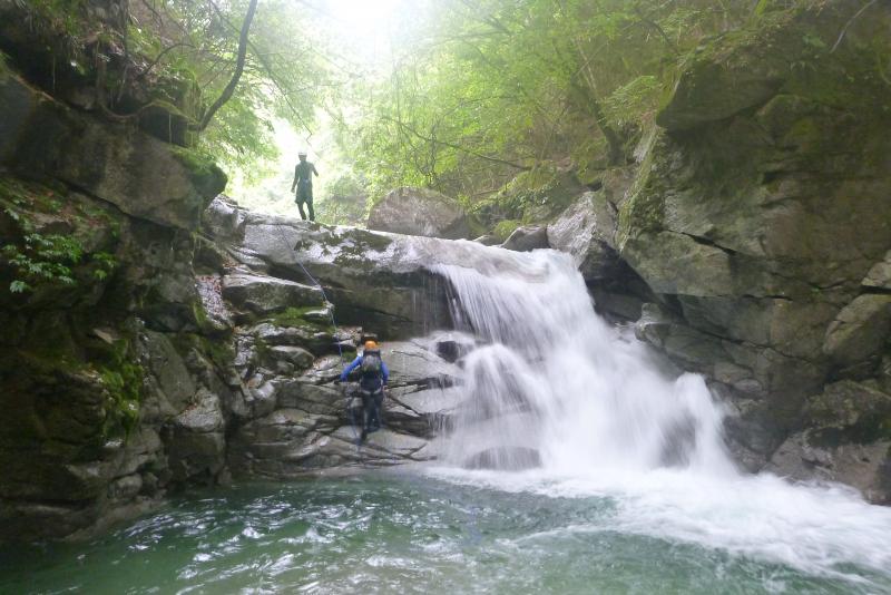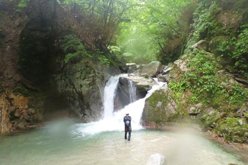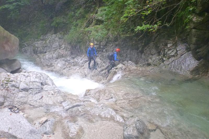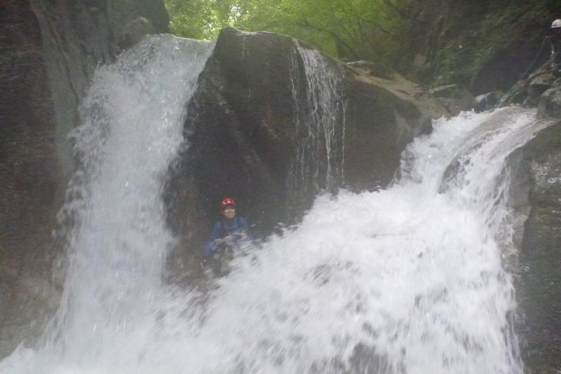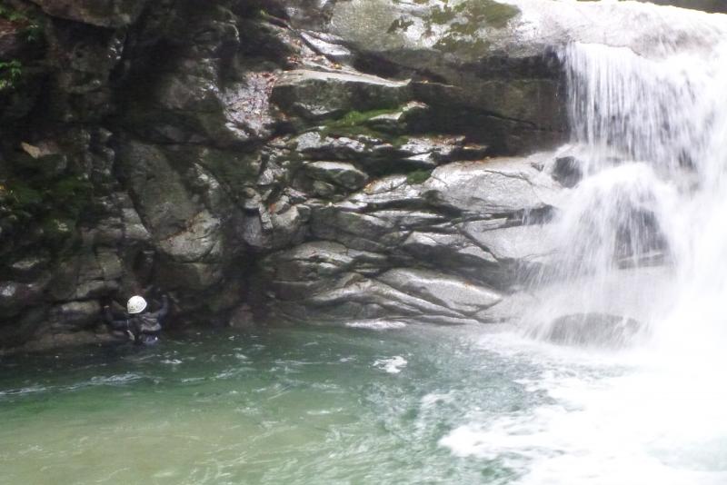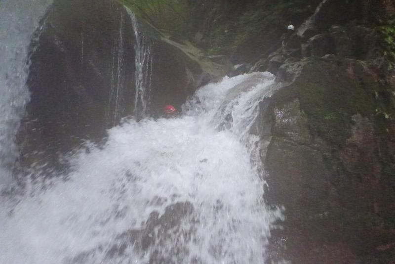 名古屋栄店の本田さんが、これくらいならいけるということで決行しました。結果、雨もほとんど気にならず楽しめました!ロープで確保して突破した滝は、なかなかの水流でしたが4人とも無事に突破。最後はかなり寒くなりましたが、これくらいの雨ならいけるといういい経験になりました。