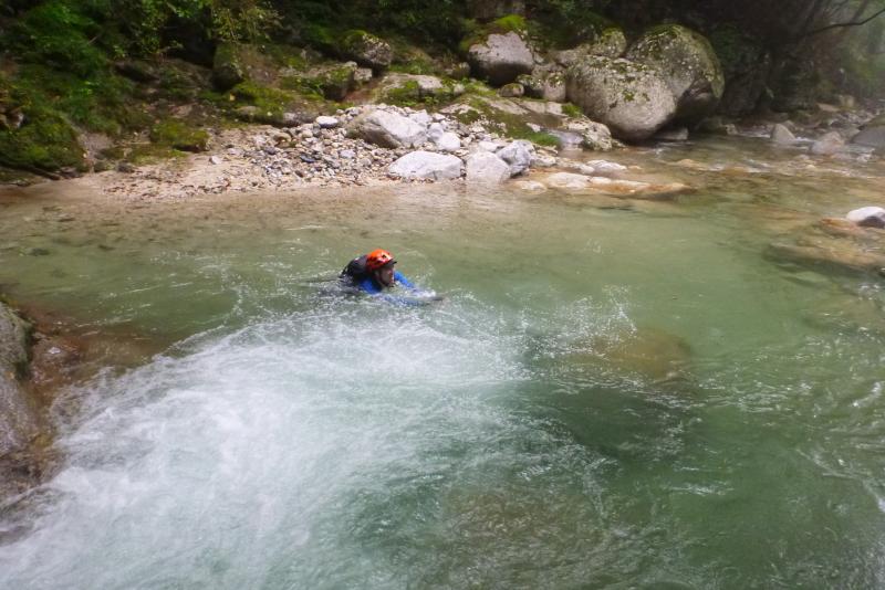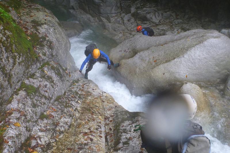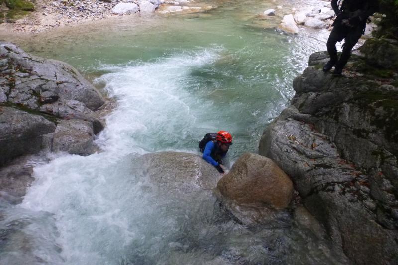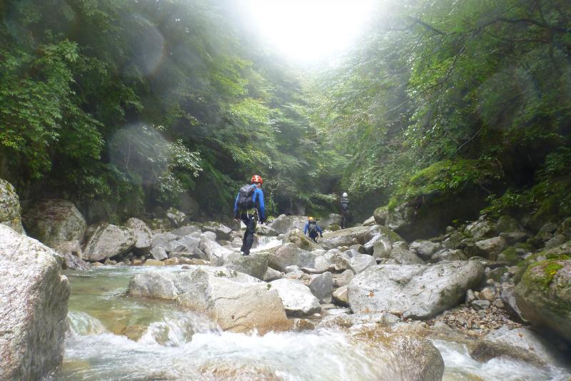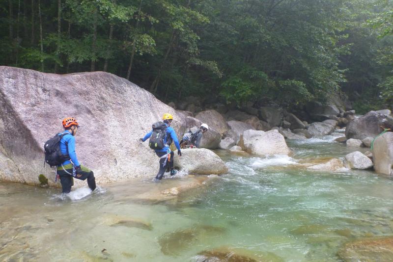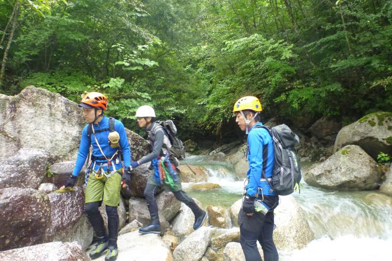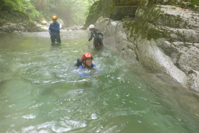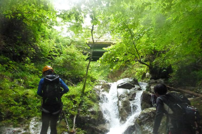 名古屋栄店の本田さんが、これくらいならいけるということで決行しました。結果、雨もほとんど気にならず楽しめました!ロープで確保して突破した滝は、なかなかの水流でしたが4人とも無事に突破。最後はかなり寒くなりましたが、これくらいの雨ならいけるといういい経験になりました。